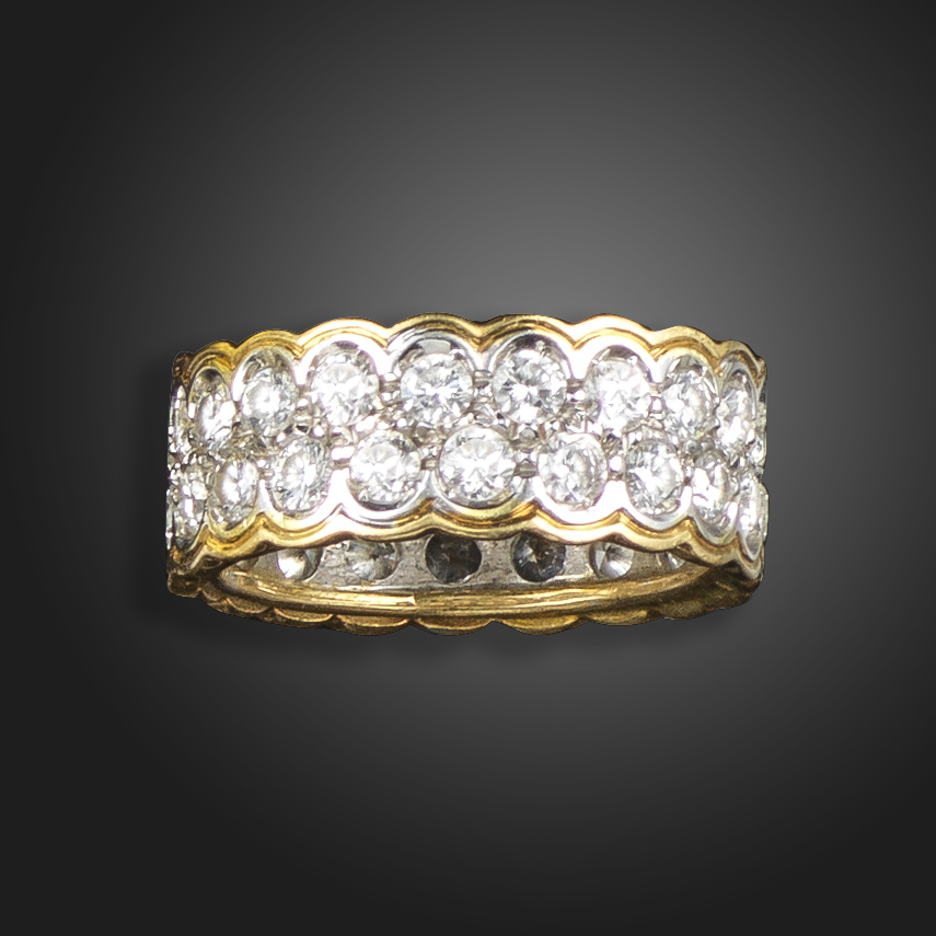 A diamond full-circle eternity ring, set with two rows of round brilliant-cut diamonds with scalloped border in two-colour gold, size L