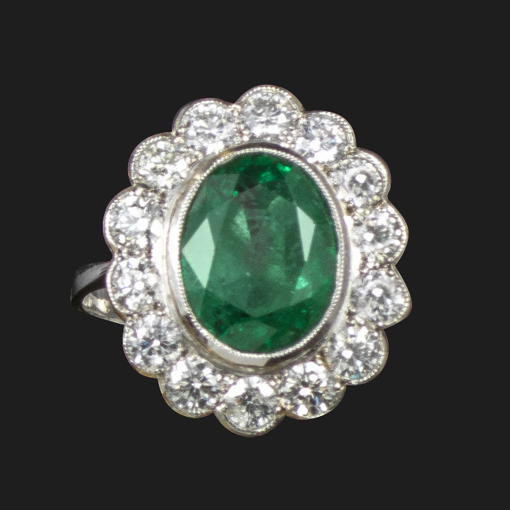 An emerald and diamond cluster ring