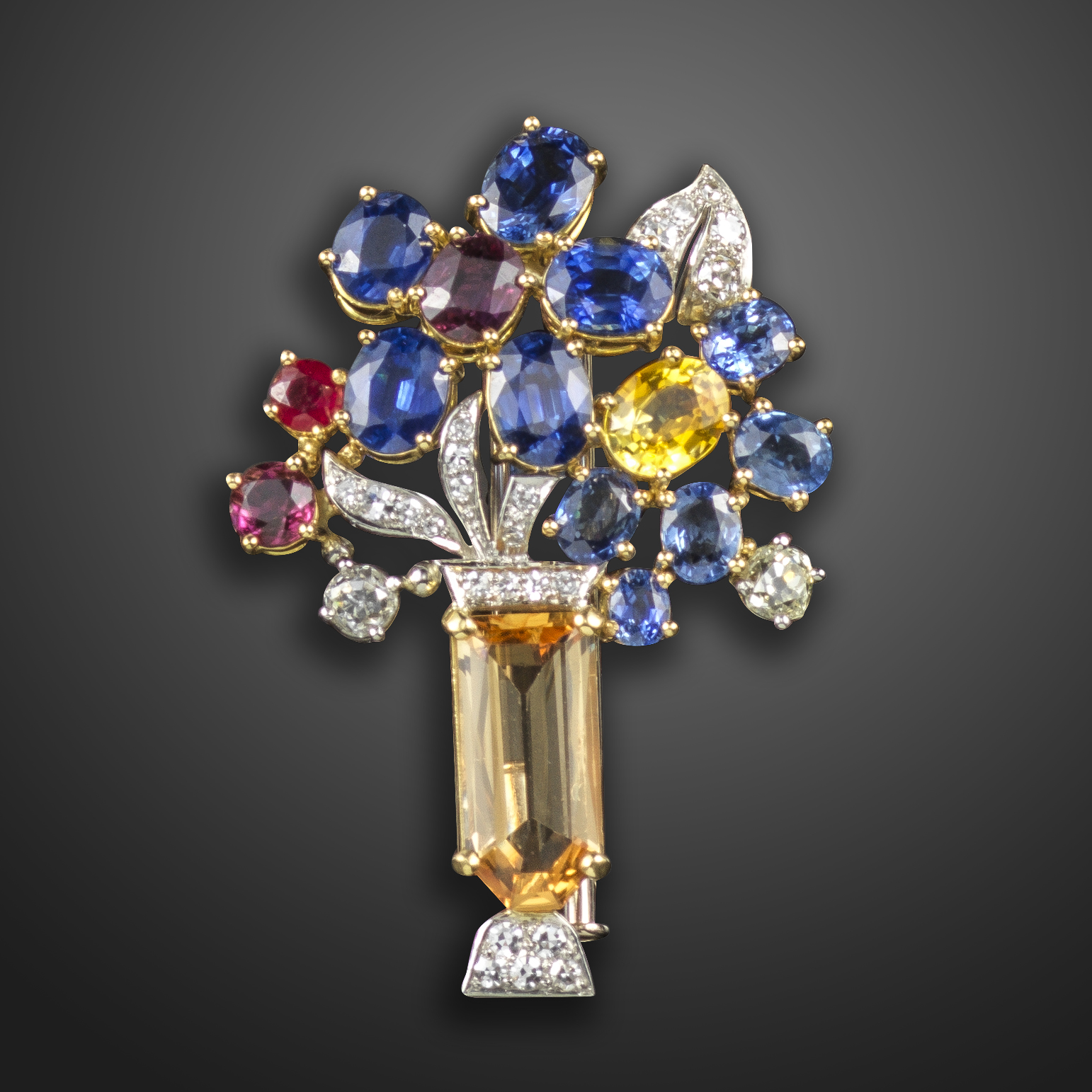 A gem-set giardinetto brooch by Boucheron, set with an orange topaz base, the flowers set with sapphires, rubies and diamonds in platinum and gold, signed, 4.6cm high