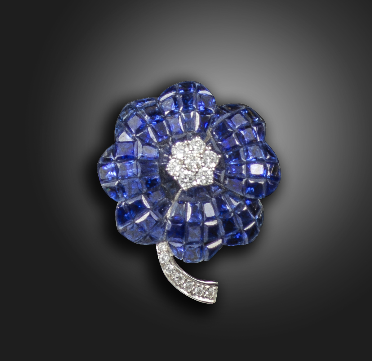 A sapphire and diamond-set flower pendant, centred with a cluster of round brilliant-cut diamonds, with petals invisibly-set with calibre-cut sapphires, further diamonds to the stamen in white gold, 2.7cm high