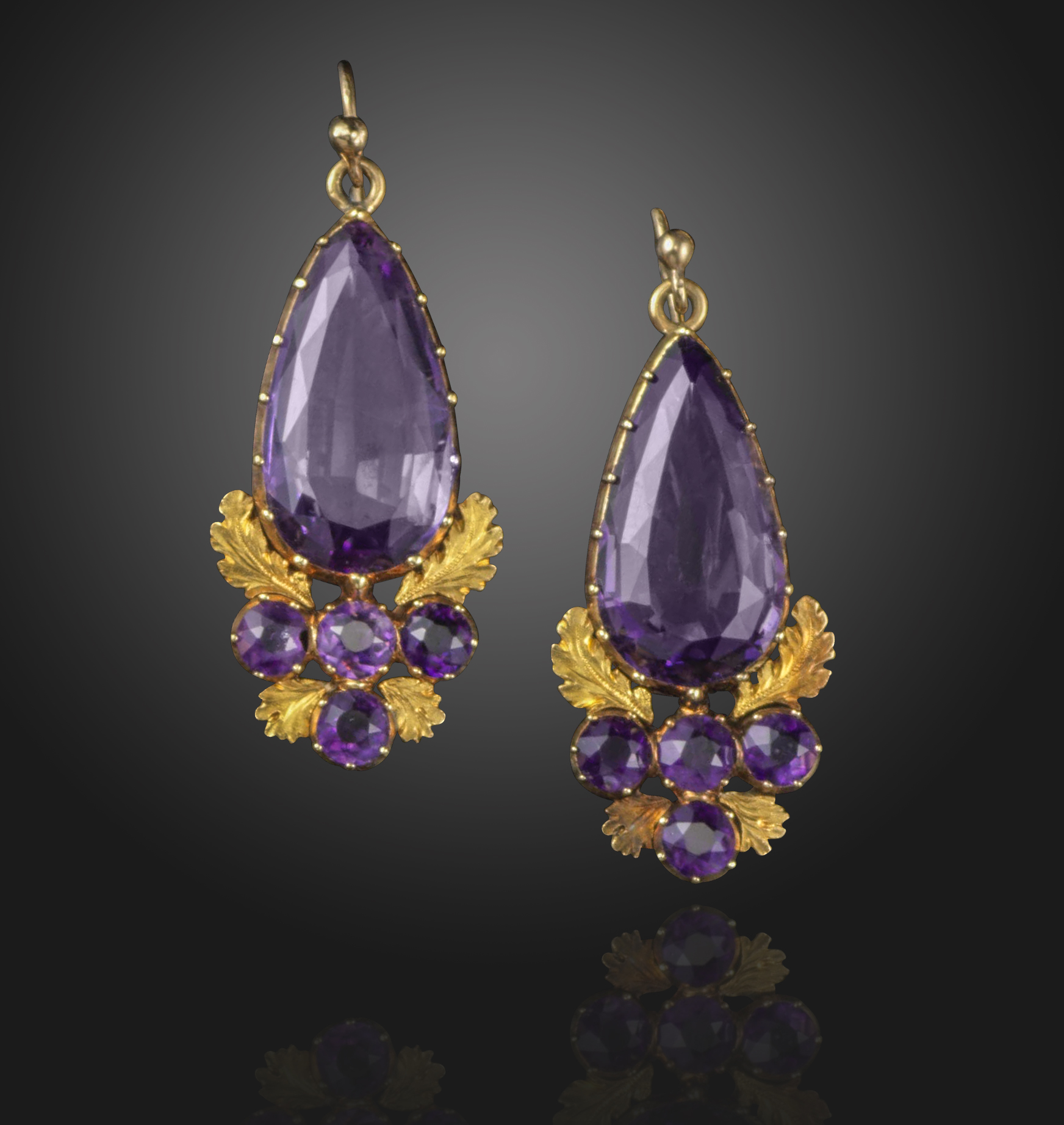 A pair of mid 19th century amethyst and gold earrings, the pear-shaped amethysts are set above gold oak leaves and four further amethysts, 4.8cm high including posts
