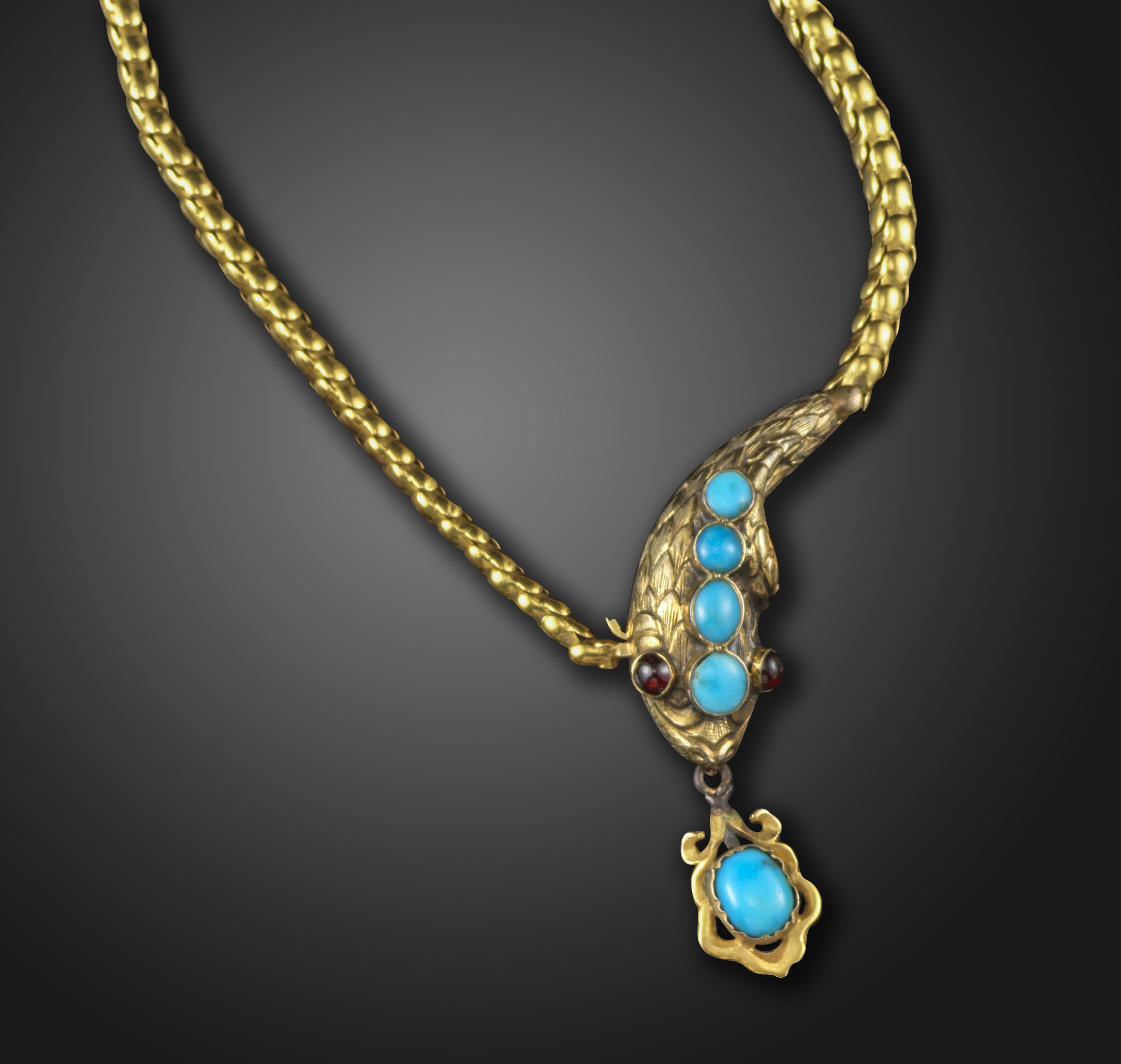 A Victorian gem-set gold snake necklace, the head set with graduated turquoise cabochons and garnet eyes, suspending a turquoise-set gold drop, on a graduated snake-link necklace, 43cm long