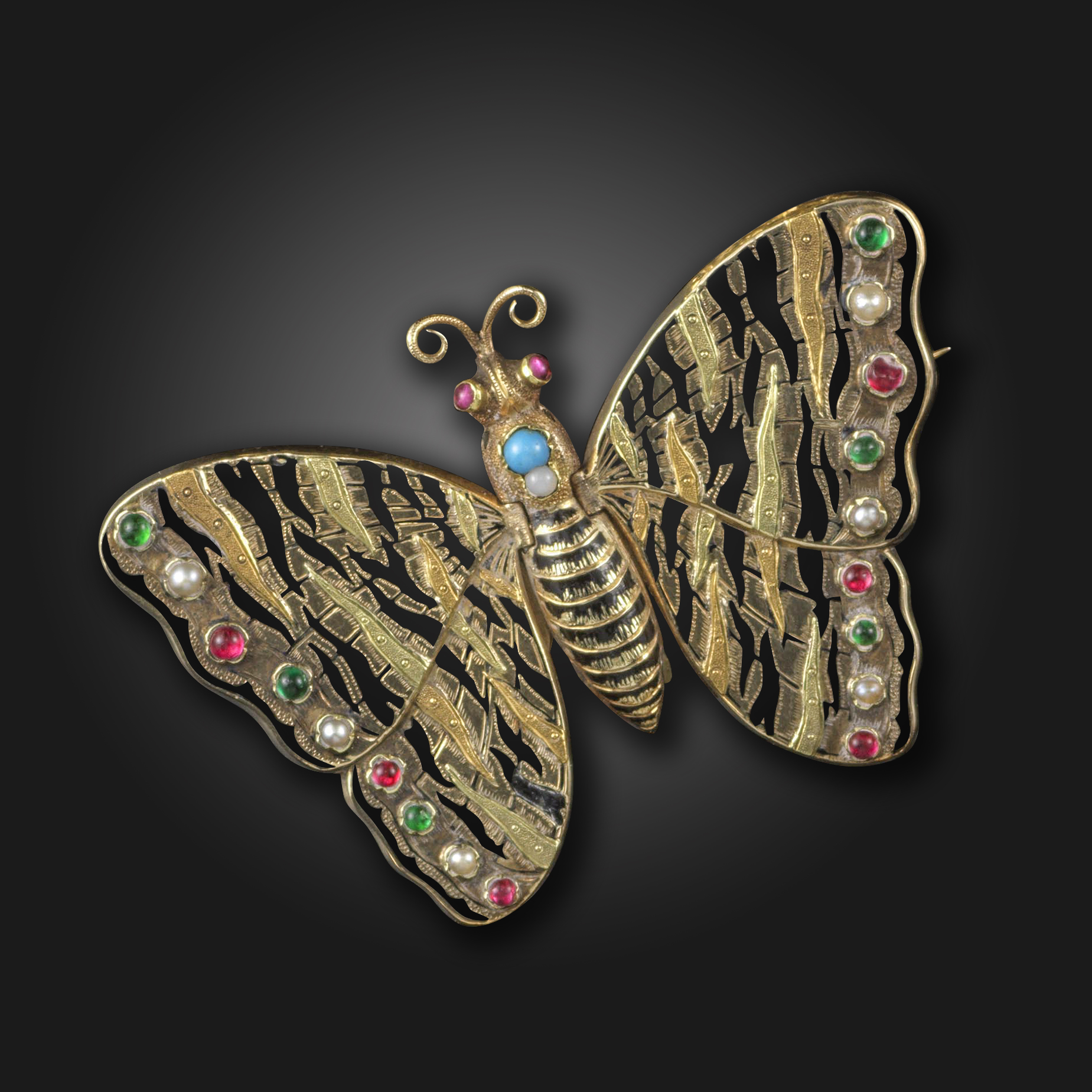 An Aesthetic Movement gem-set gold butterfly brooch, set with vari-coloured paste cabochons and seed pearls, with black enamel decoration in two-colour gold, 5.8cm wide, case