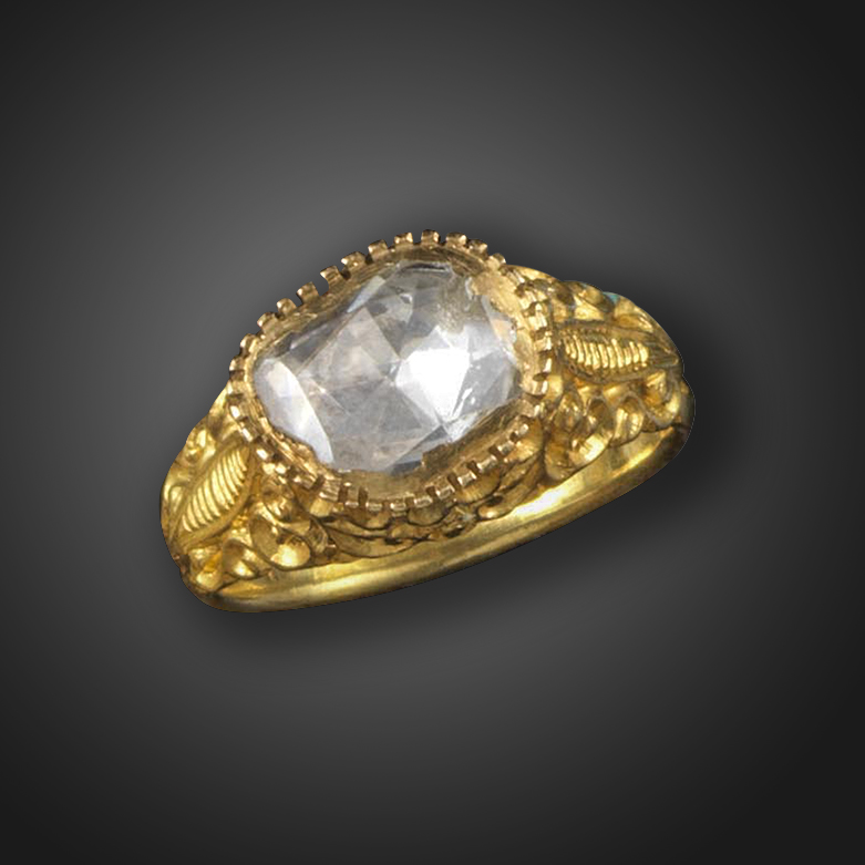 A rose-cut diamond solitaire ring, bezel-set with engraved and pierced scroll decoration to the gallery in gold, size L1/2