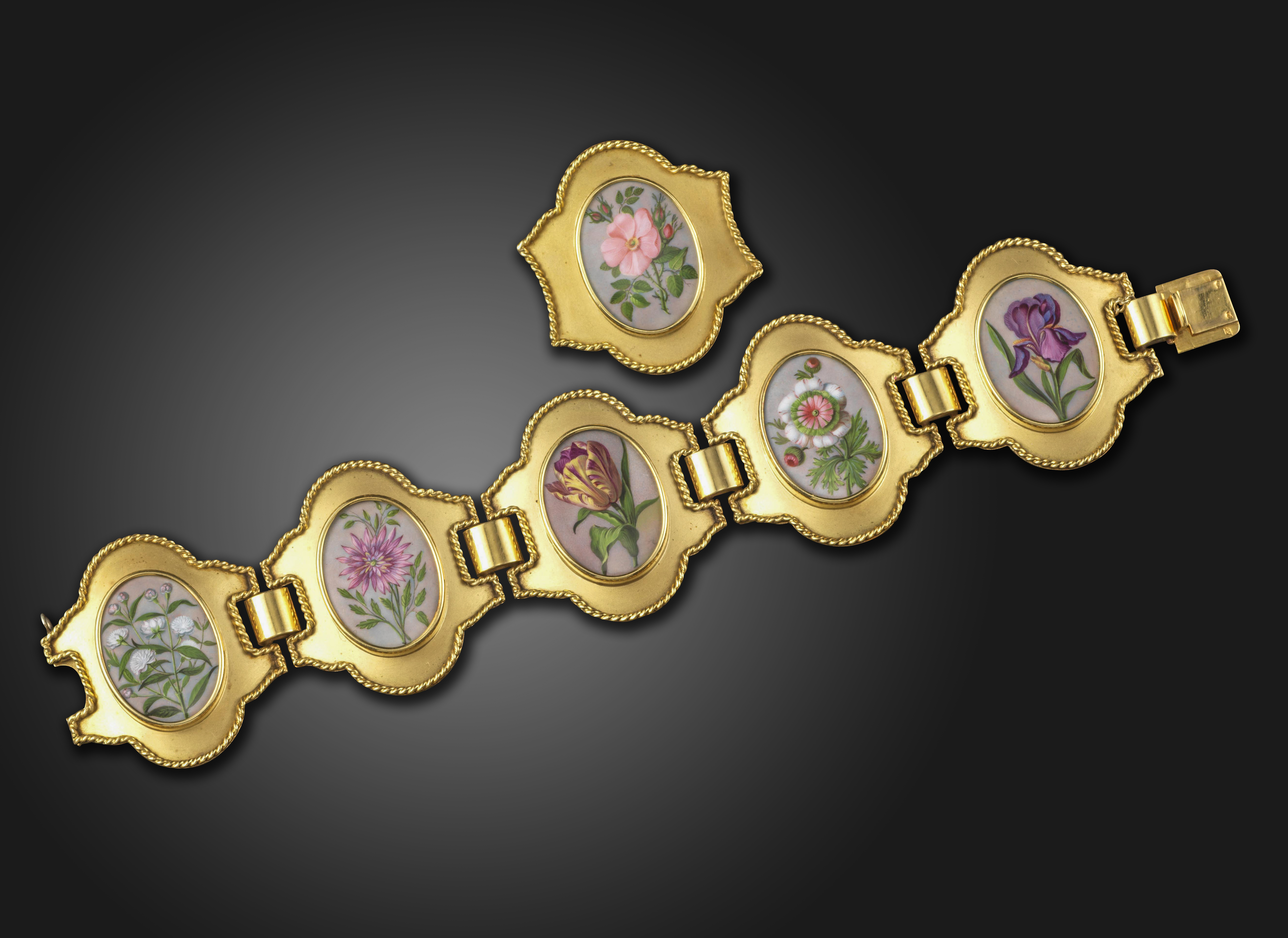 A 19th century French gold panel bracelet mounted with five painted foliate plaques, each depicting a different flower including carnations, dahlias, tulips, peonies and iris, 18cm long, with a matching gold brooch painted with a wild rose in yellow gold 3.9cm high, French control marks and maker's lozenge, fitted case