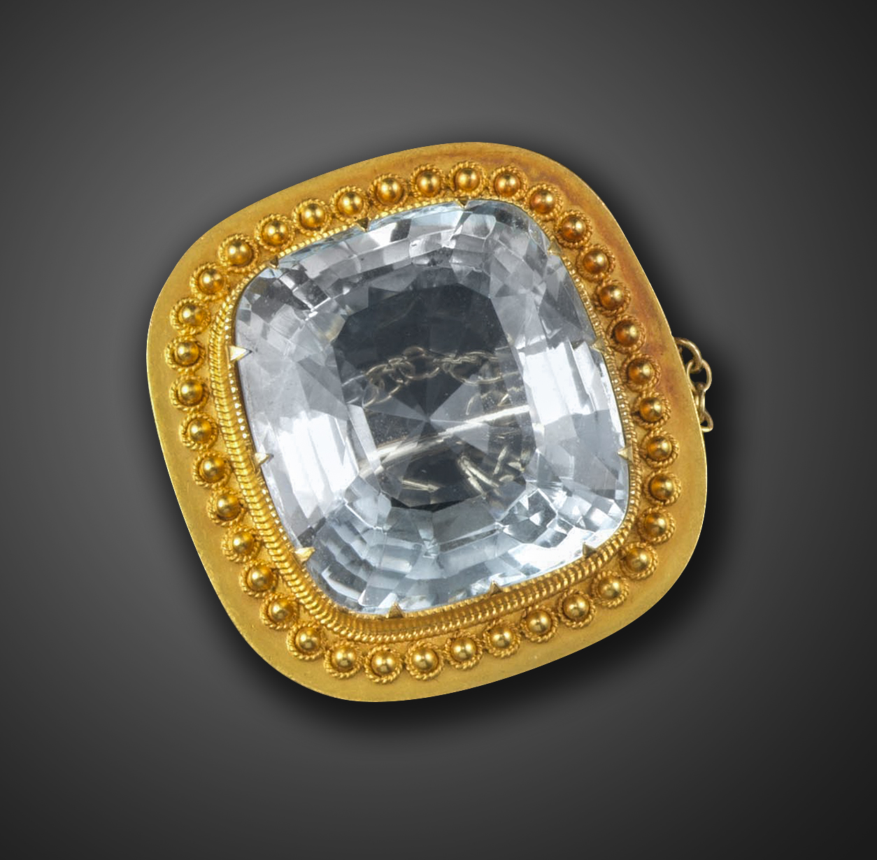 A Victorian topaz-set gold brooch, the cushion-shaped blue topaz set in a square-shaped Archaeological Revival mount, with pellet and ropetwist decoration in gold, 3cm wide