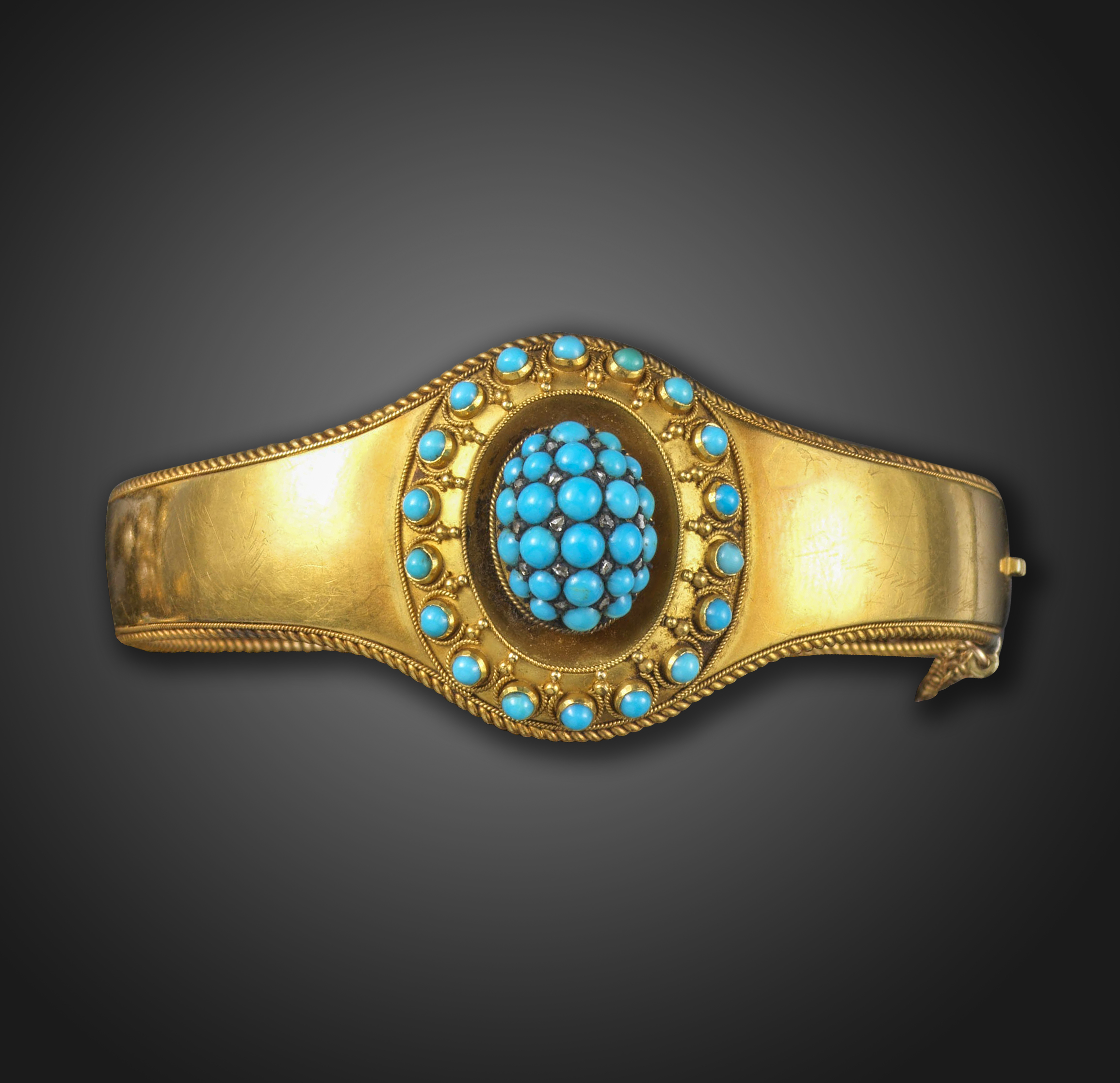 A Victorian turquoise and diamond bangle, the central raised oval dome pave-set with turquoise cabochons and rose-cut diamonds within wirework and pellet-decorated surround set with further turquoise cabochons and a rope twist border overall, in yellow gold. 6.3cm inner diameter