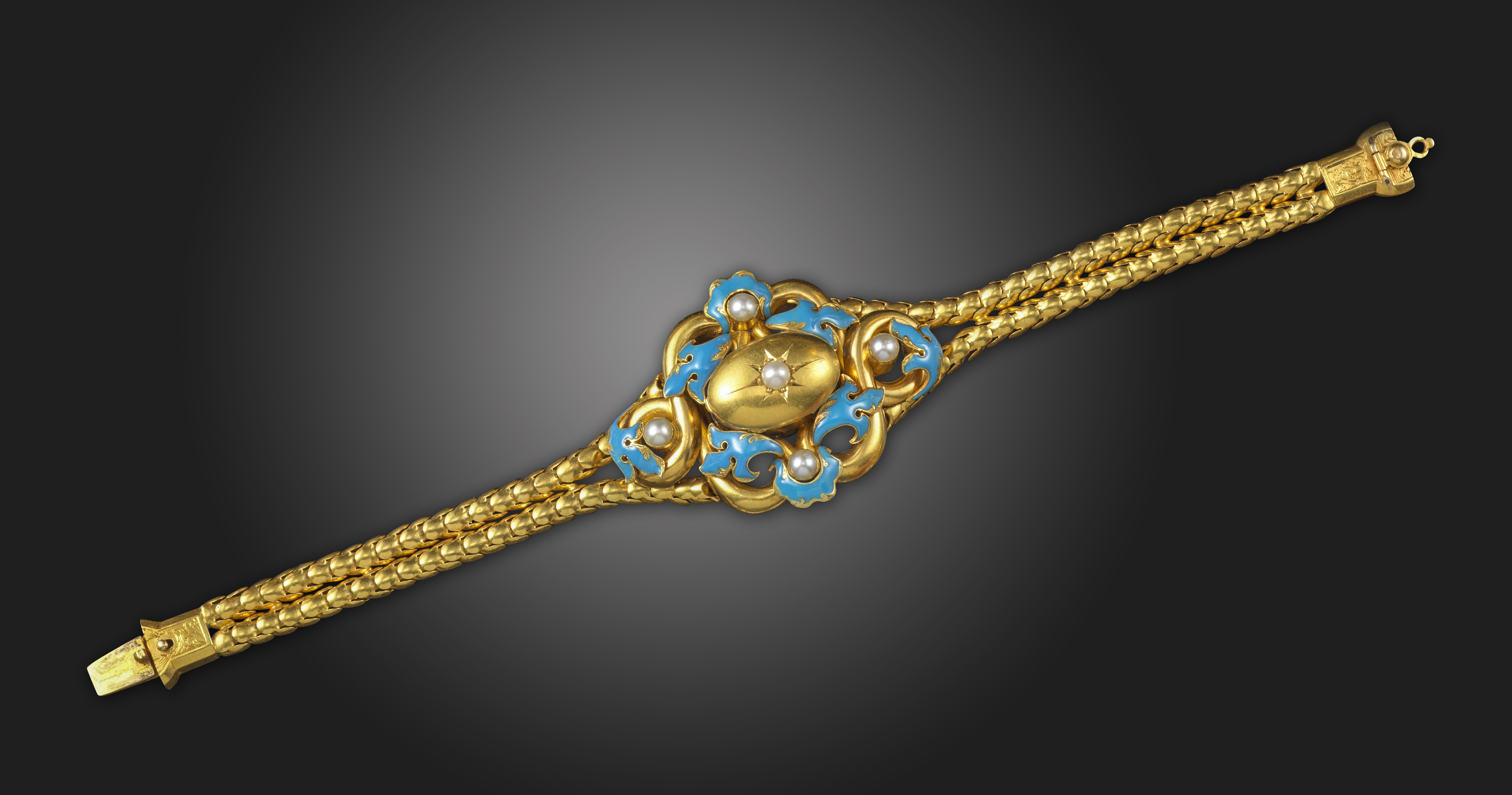 A Victorian blue enamel and pearl bracelet, set with seed pearls and light blue enamel scrolling decoration on a gold double snake-link bracelet, maker's mark JL (possibly for John Linnit), 18cm long, 33g