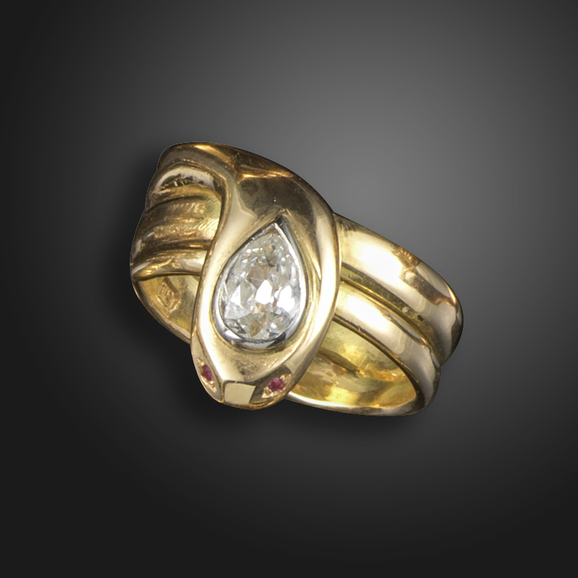 A diamond-set gold snake ring, set with an old pear-shaped diamond weighing approximately 0.35cts, with ruby eyes in gold, size L