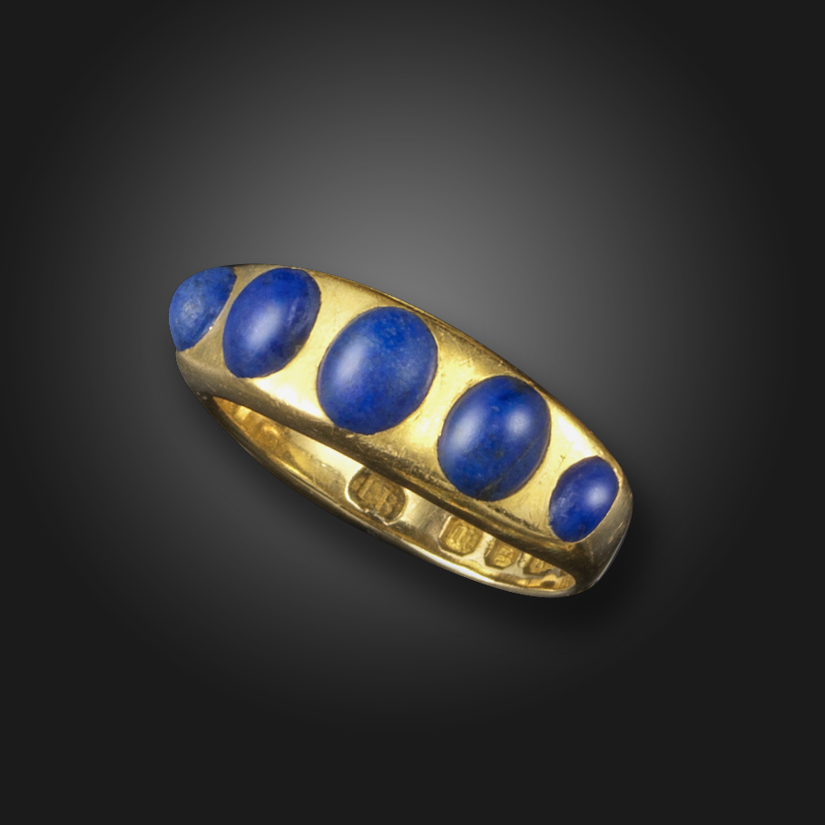 A Victorian lapis lazui-set gold gypsy ring, set with graduated lapis lazuli cabochons in gold, 18ct London hallmarks for 1867, maker's mark IB, size N