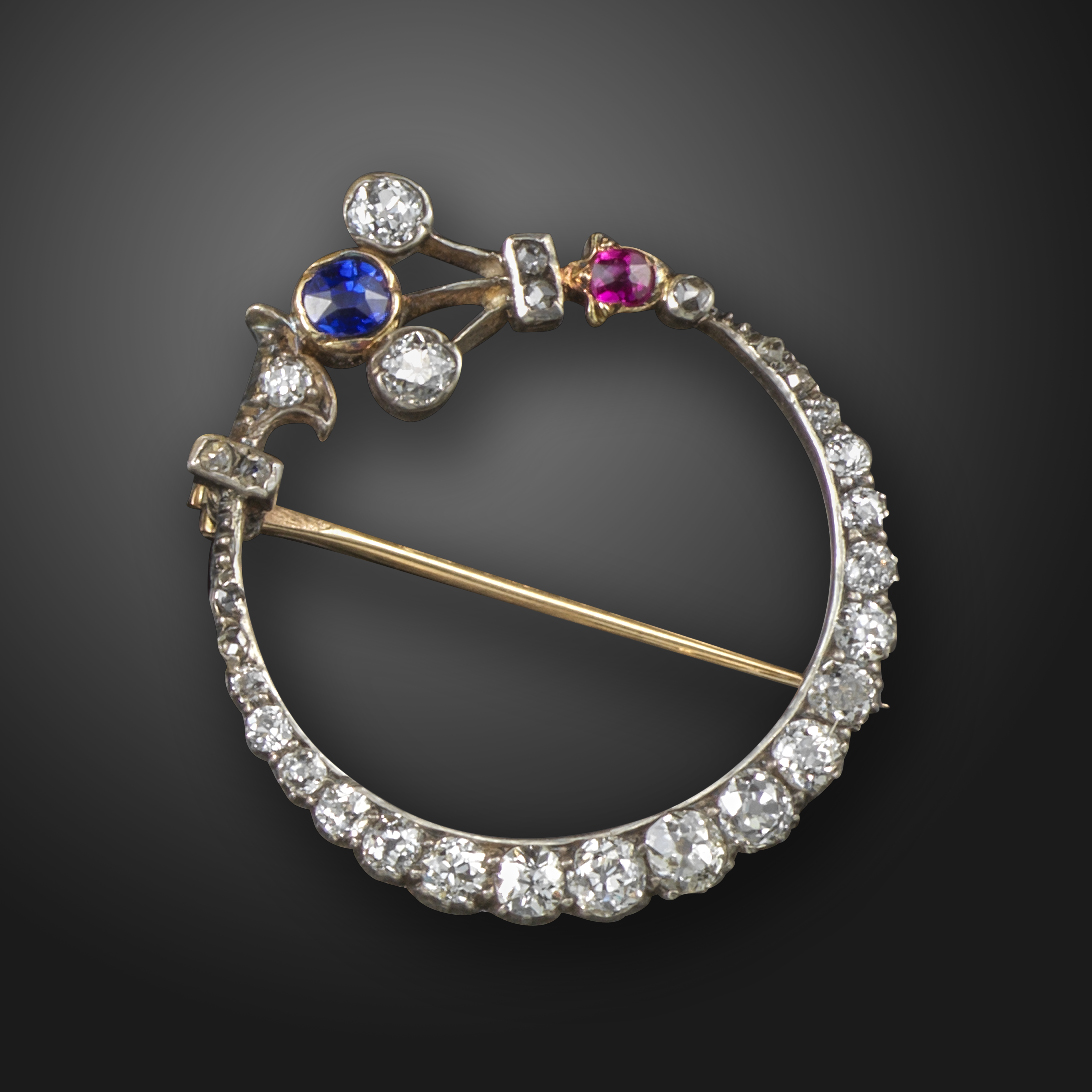 A Victorian gem-set crescent brooch, set with graduated old circular-cut diamonds, a sapphire and a ruby in silver and gold, 2.8cm wide