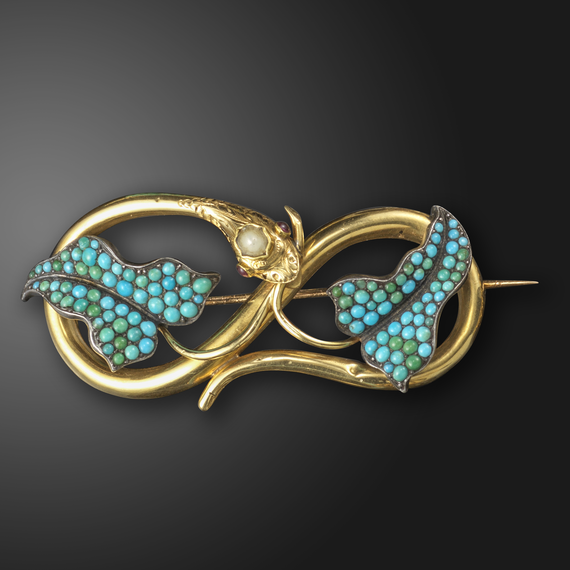 A Victorian gem-set snake brooch, the knotted serpent set with a seed pearl and ruby eyes, with engraved decoration in gold, surmounted with turquoise-set leaves in silver on gold, 5.7cm wide