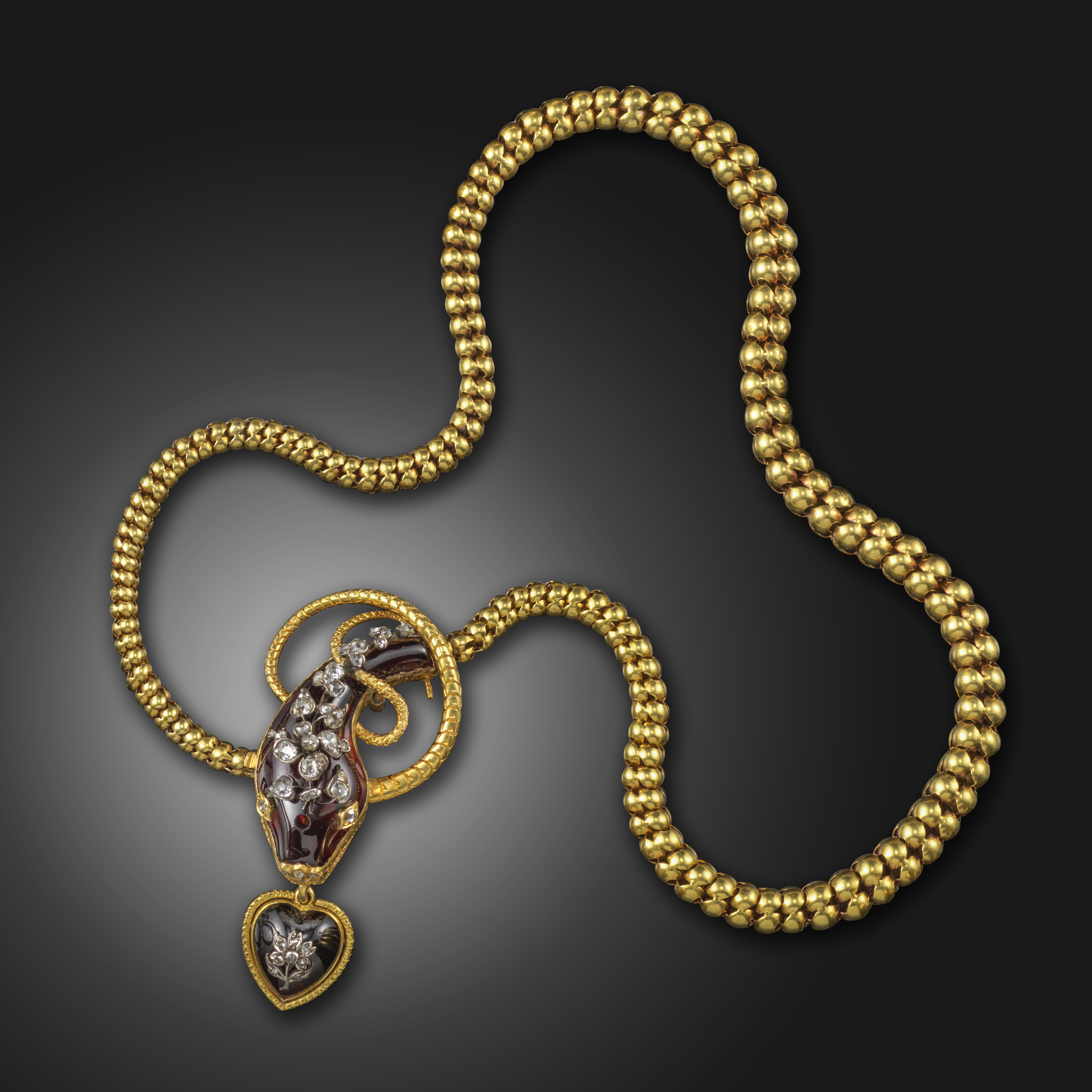 A Victorian garnet and diamond snake necklace, the stylised serpent's head formed from a garnet set with diamonds and suspending a garnet and diamond heart from its mouth, on an articulated gold snake-link body, 44cm long