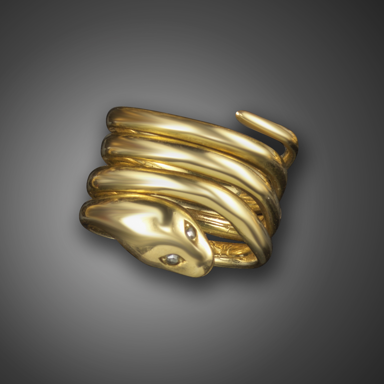 A Victorian gold coiled snake ring, with rose-cut diamond eyes, stamped 18 and maker's mark GB, approximately size U, 24g