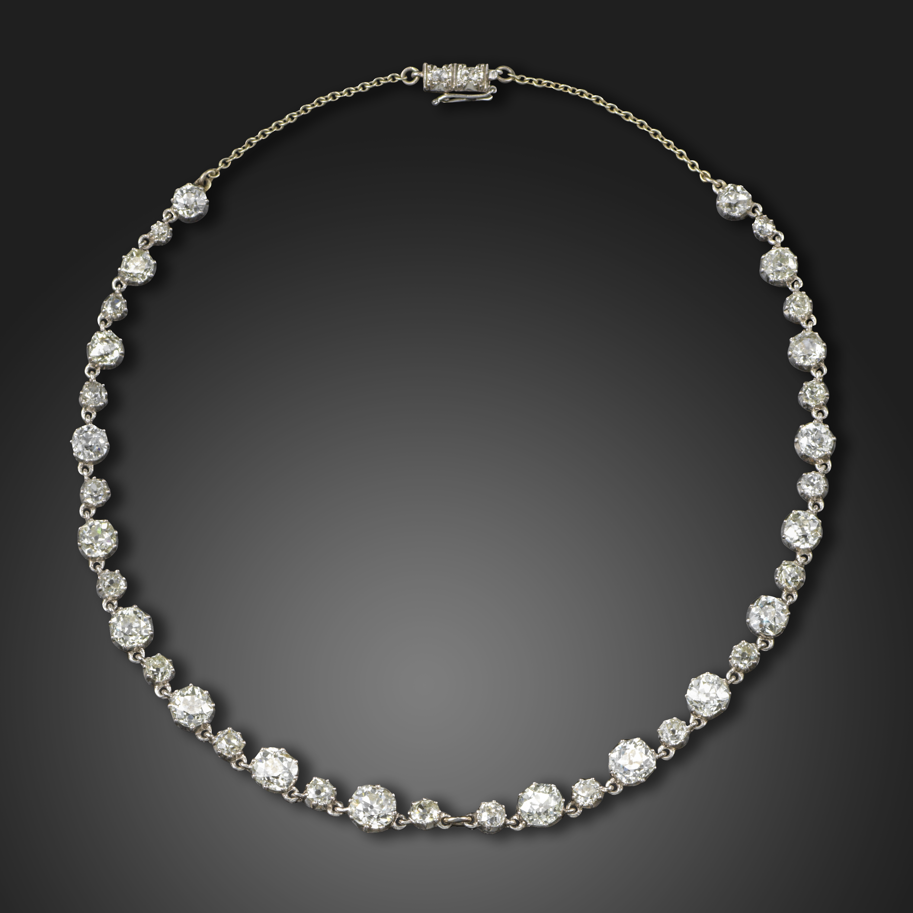 An early 20th century diamond choker necklace, set with graduated old circular-cut diamonds, with smaller old circular-cut diamond spacers in platinum cut-down collets, diamonds very approximately 8.50cts total, 30cm long