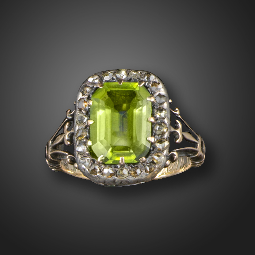A Victorian peridot and diamond cluster ring, set with an emerald-cut peridot within a border of rose-cut diamonds in silver and gold, size J ½