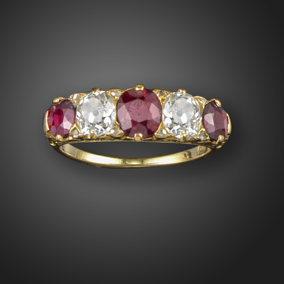 A late 19th century ruby and diamond half-hoop ring, set with graduated cushion-cut rubies and cushion-cut diamonds, in a scroll pierced yellow gold mount, size O 1/2