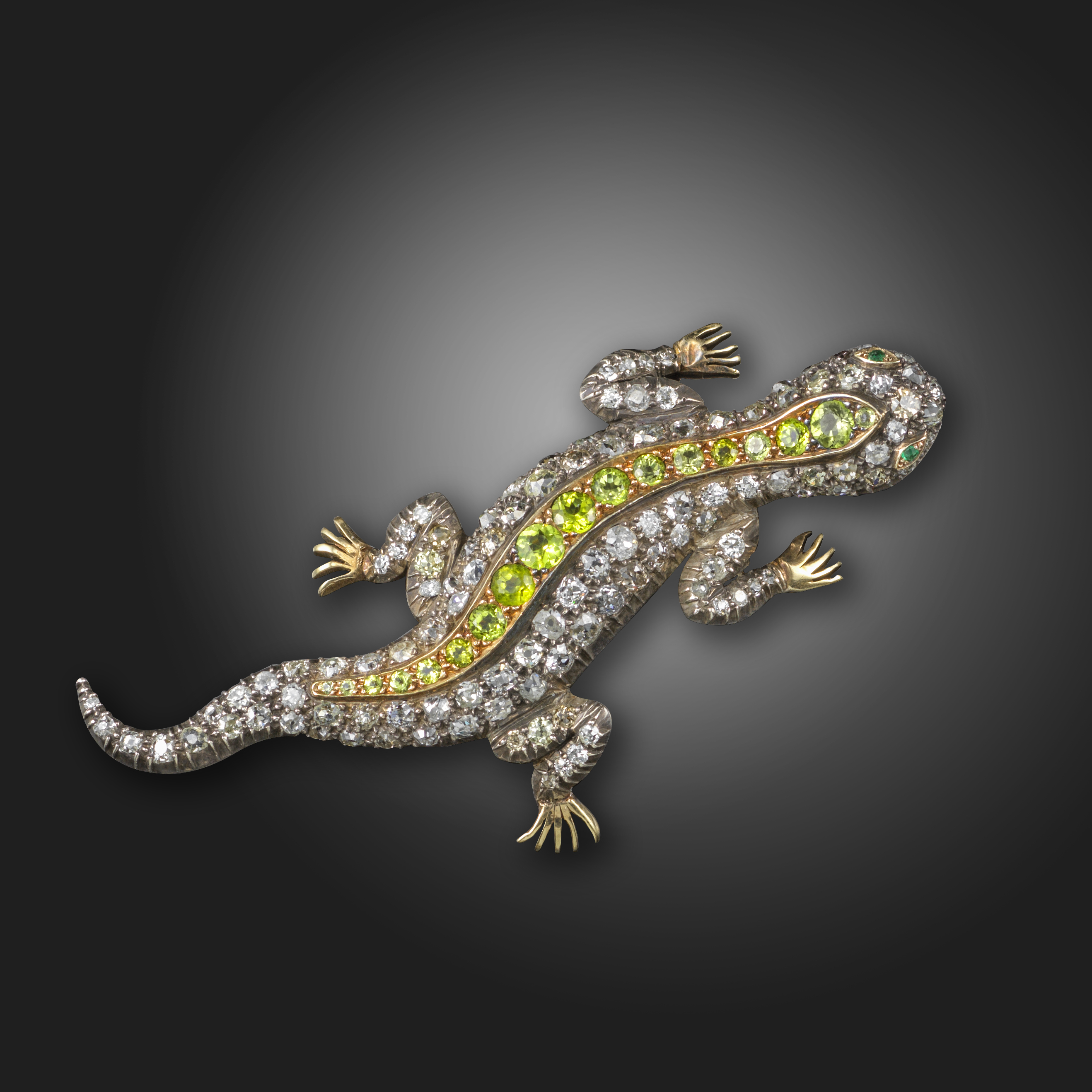 A late 19th century lizard brooch, of realistic gecko form and pavé-set with graduated circular-cut diamonds and a centre line of graduated circular-cut peridots, emerald eyes, mounted in silver and gold, 8cm long, fitted case