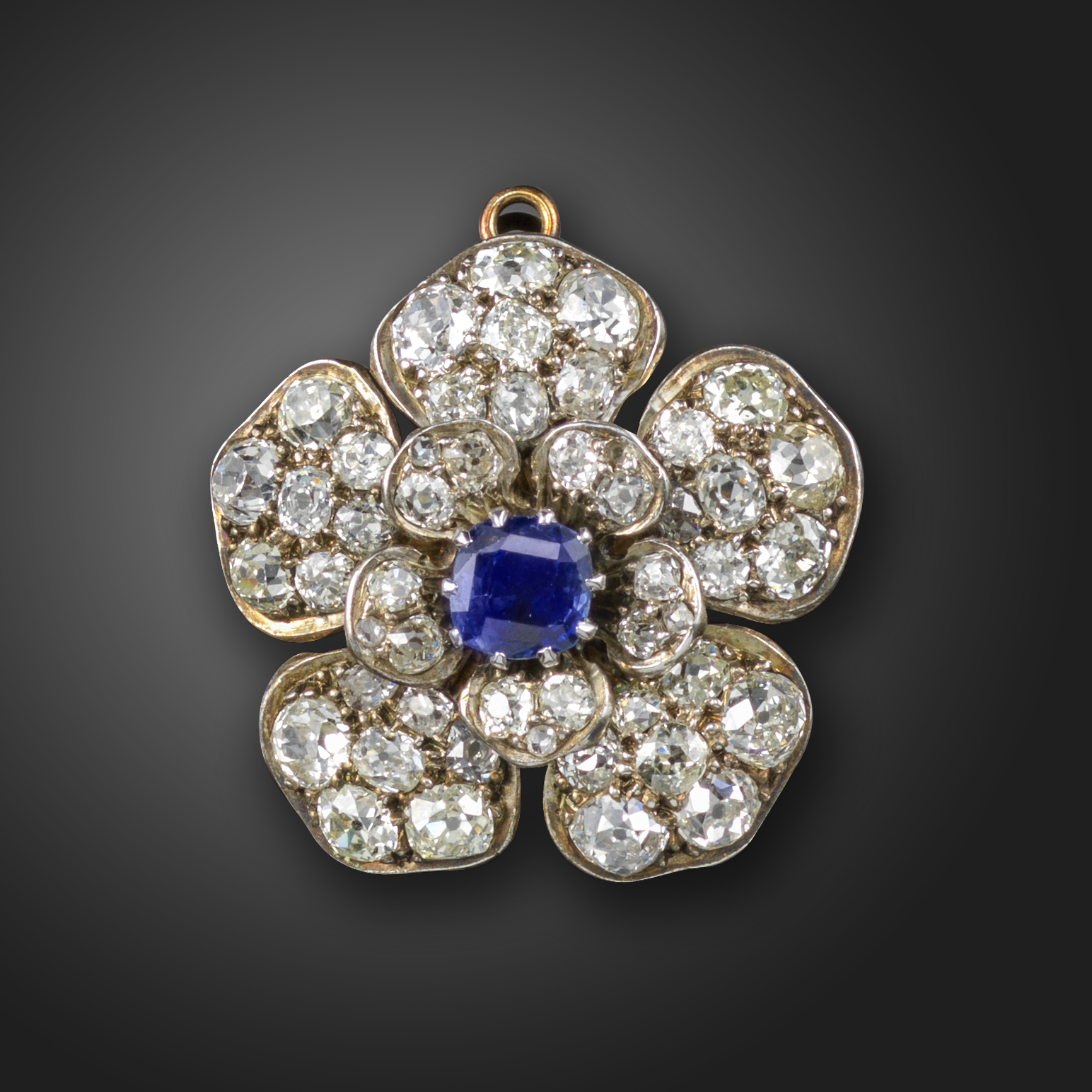 A Victorian sapphire and diamond flowerhead brooch pendant