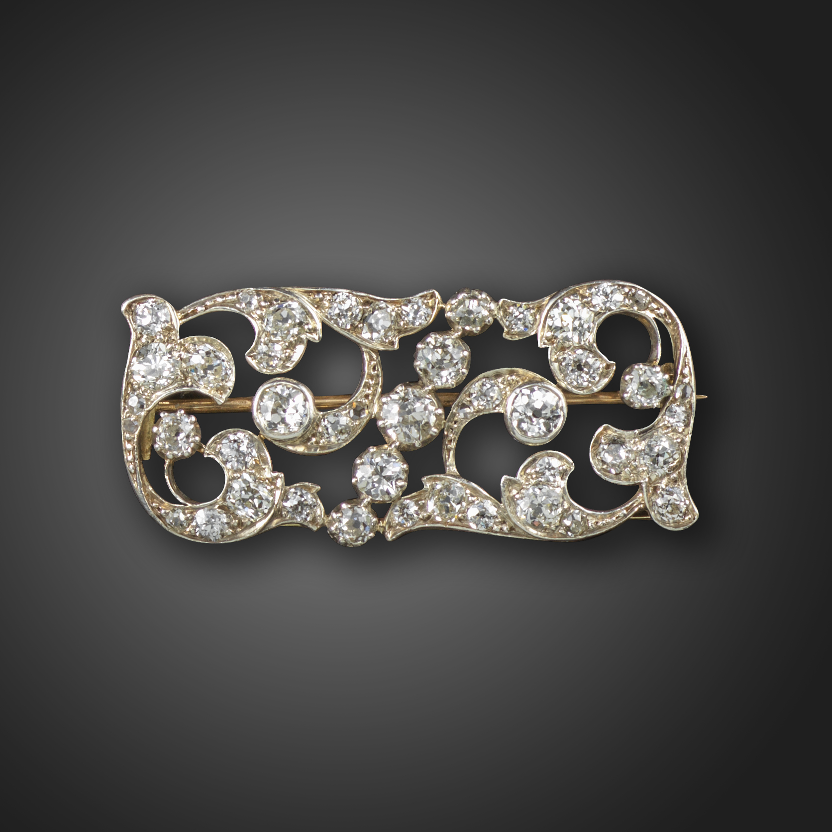 A Victorian composite diamond plaque brooch, set with graduated old circular-cut diamonds to the scroll mount in silver on gold, 4.2cm wide