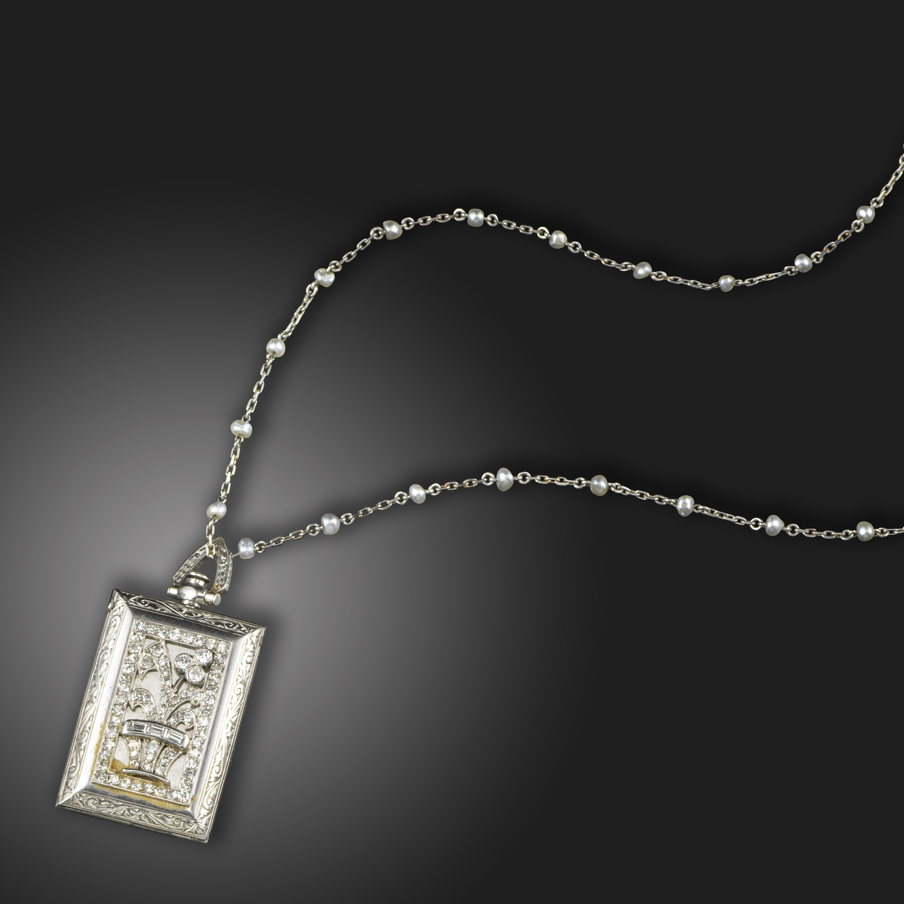 An Art Deco diamond-set travel clock pendant, the rectangular pendant case applied with a diamond-set foliate motif, with scroll engraved border in platinum, the square clock dial with Arabic numerals, manual winding, on a seed-pearl set platinum chain, pendant 4cm high including bale, chain 70cm long