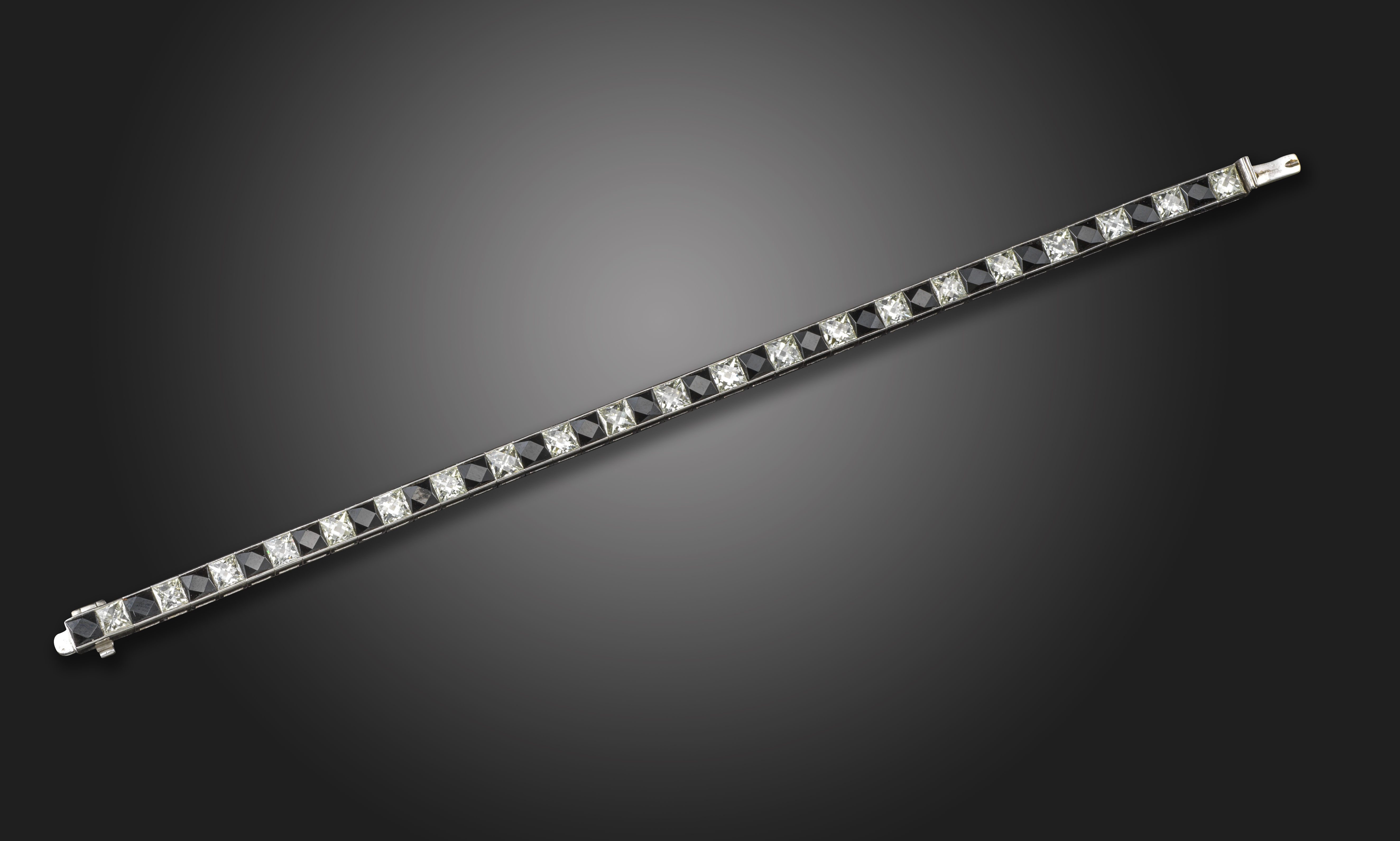 A diamond and black onyx line bracelet, alternately-set with French-cut diamonds and black onyx channel-set in platinum, approximate total diamond weight 7.00cts, 18cm long