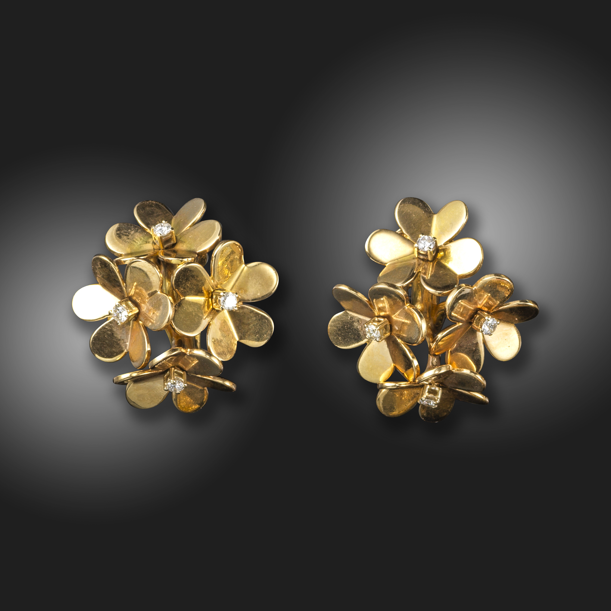 A pair of diamond-set gold foliate earrings, each rotating flowerhead centred with a round brilliant-cut diamond in yellow gold, clip fittings, 2.8cm high