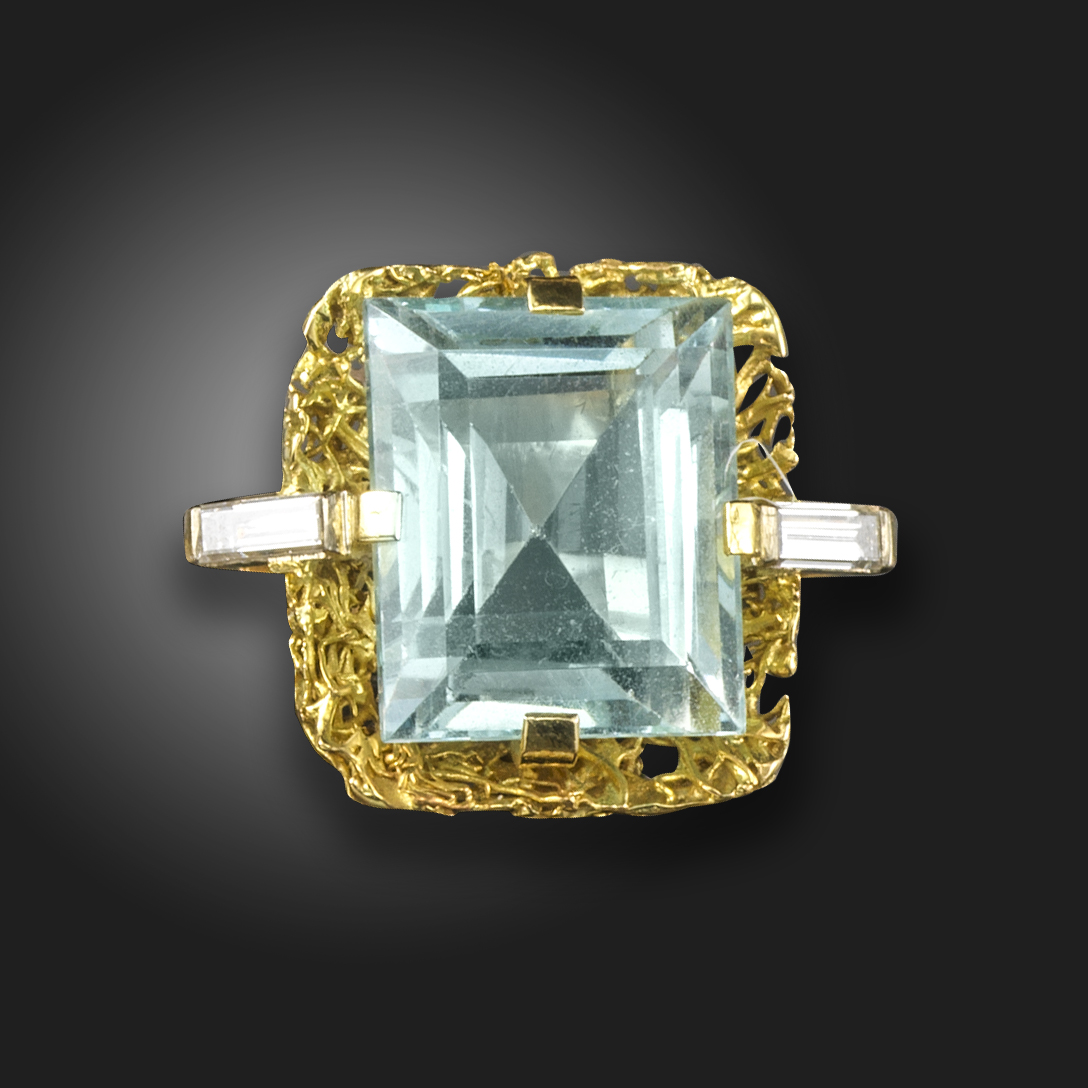 An aquamarine and diamond abstract ring, the rectangular step-cut aquamarine is set within textured yellow gold surround with baguette-shaped diamond shoulders, size M