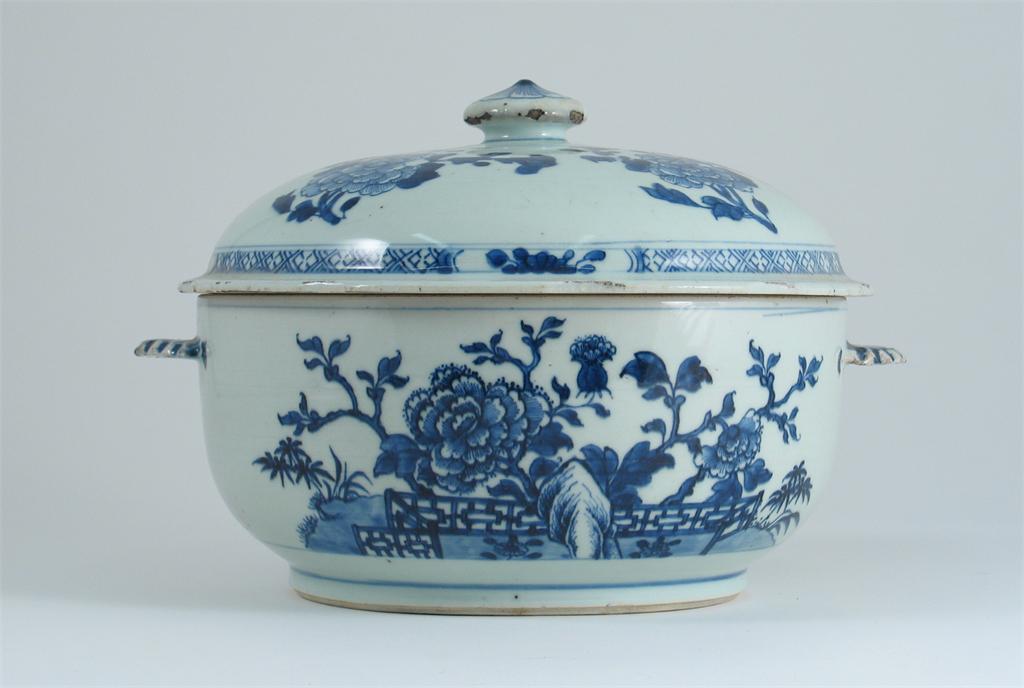 A Chinese blue and white circular tureen and cover, painted with peony, fence and rockwork. Faint cracks to the cover. 18th century, 27.5cm. (2)