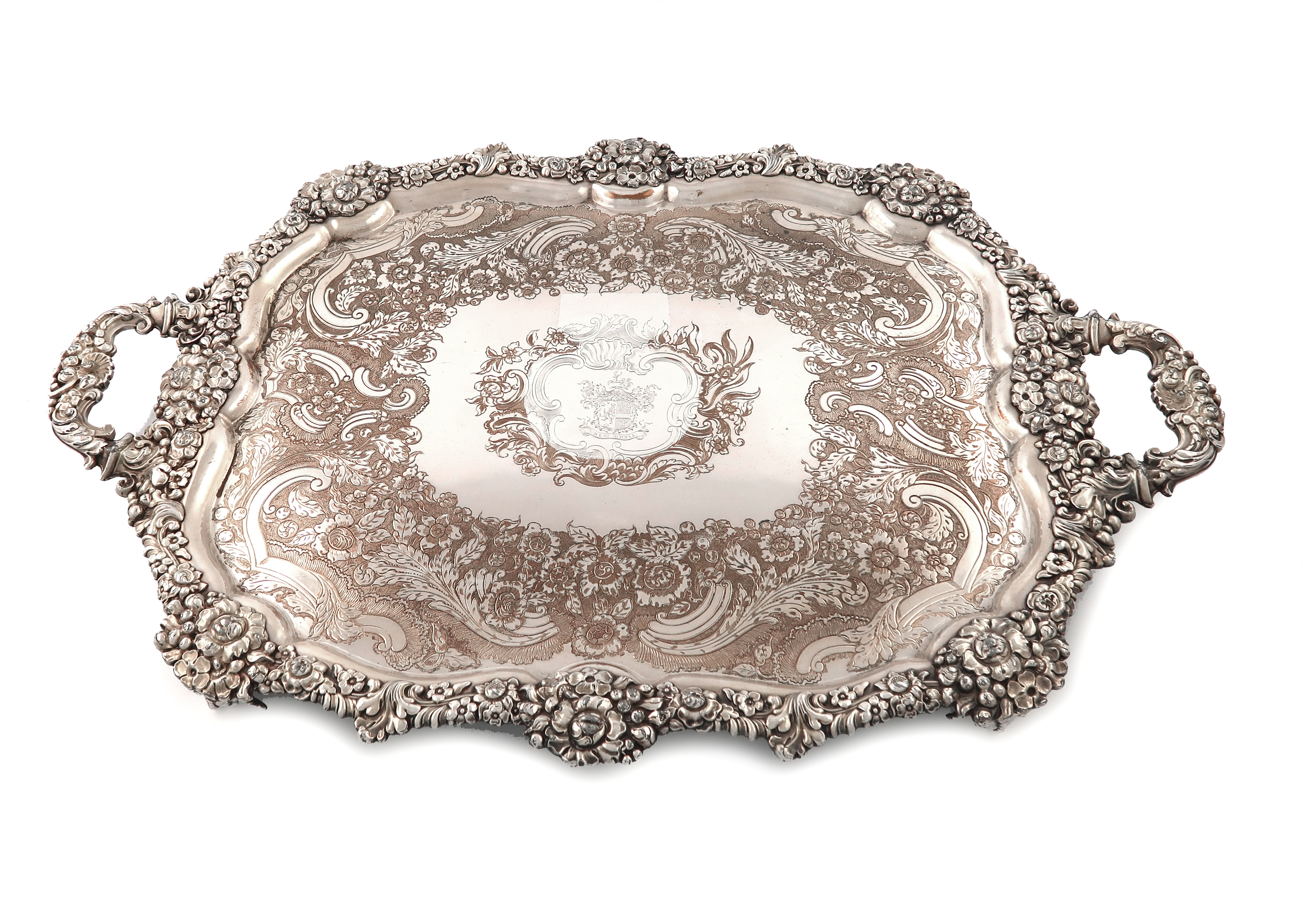 shaped oblong form, heavy foliate scroll border and handles, the centre with chased foliate decoration and with an armorial within a scroll cartouche, on four heavy claw and ball feet, length 73cm.