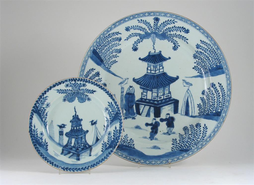 A Chinese blue and white dish, decorated with a rare scene of a man wearing a fur cape standing in front of a pagoda, 18th century, 39cm. Together with a similar smaller plate. (2)
