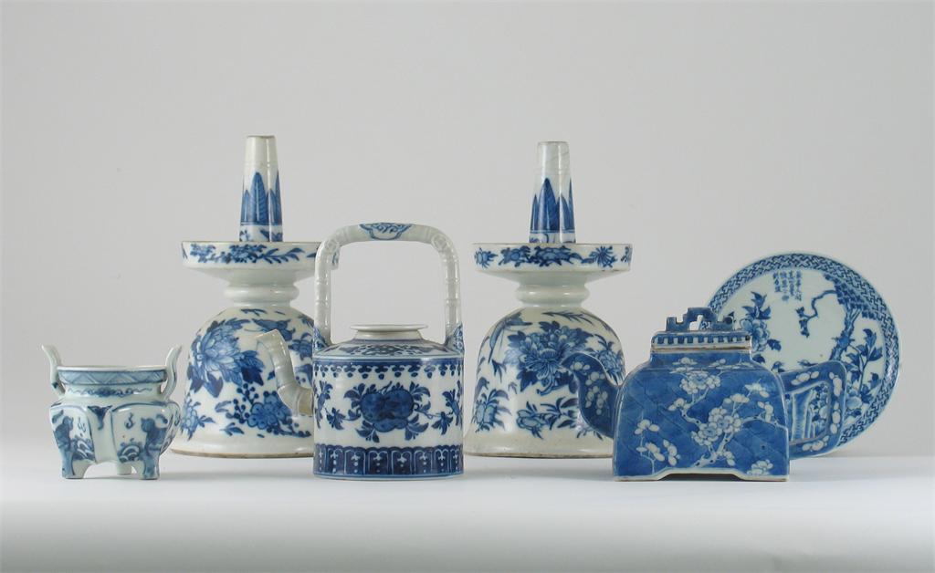 A pair of Chinese blue and white candlesticks, a blue and white ewer, a Japanese teapot and cover and two other items. Minor faults. 19th/20th century, 20.5cm. (8)
