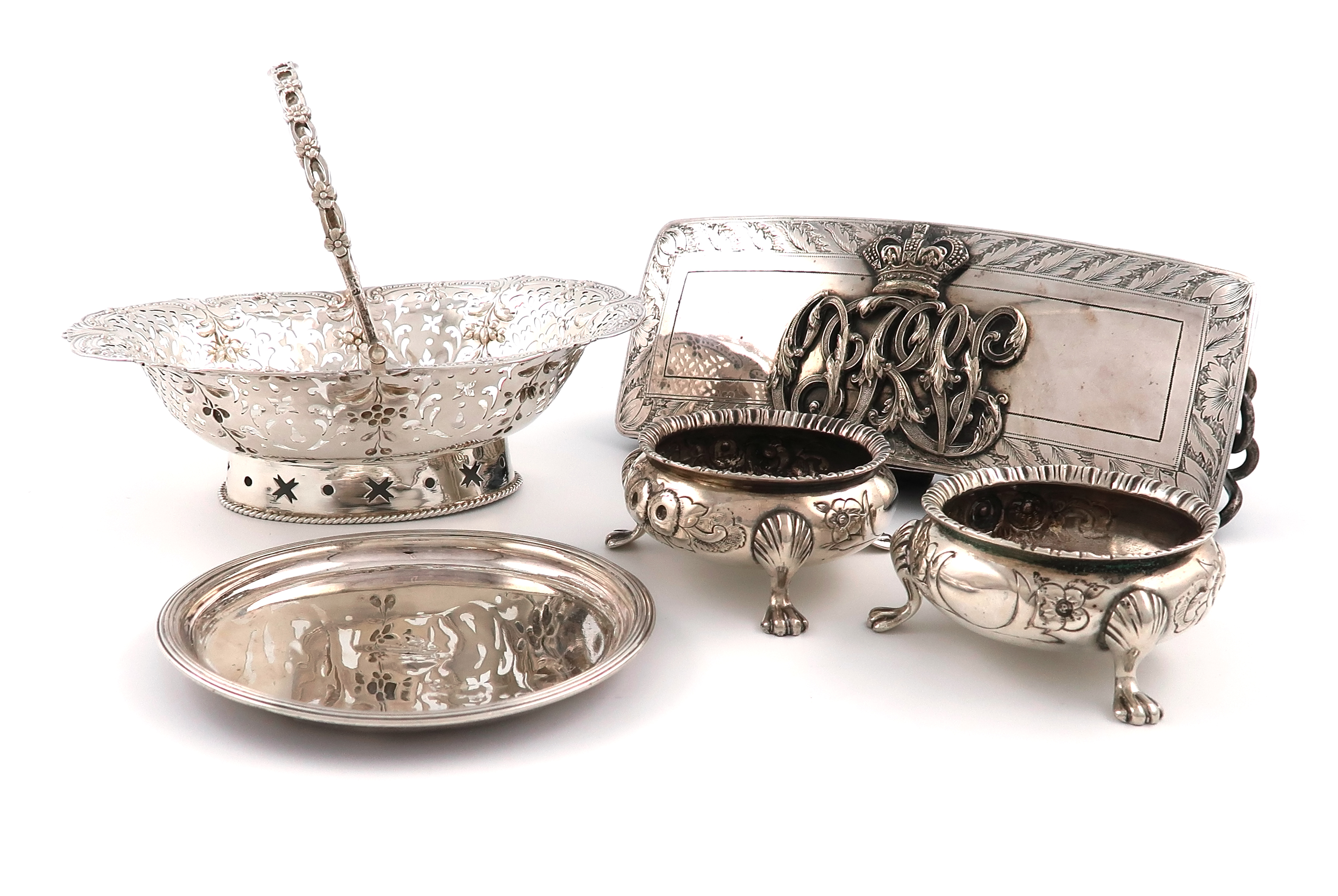 comprising: a George III wine funnel stand/counter dish, by Gustavus Byrne, Dublin 1798, plain circular form, reeded border, engraved with a crest, a George III swing handled basket, by William Vincent, London 1775, pierced and embossed decoration, a pair of Victorian salt cellars, by Robert Harper, London 1867, cauldron form, embossed decoration and gadrooned border, and a shoulder belt pouch with the regimental initials ORV, approx. weighable 9.8oz. (5)