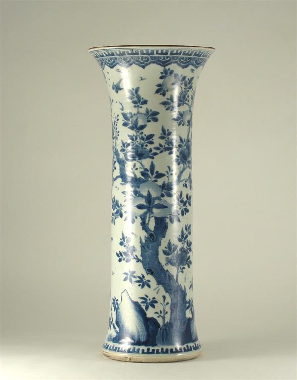 A large Chinese blue and white sleeve vase, painted with a fruiting and flowering peach tree and with birds in flight. Traces of enamel decoration. 18th century, 53.5cm.