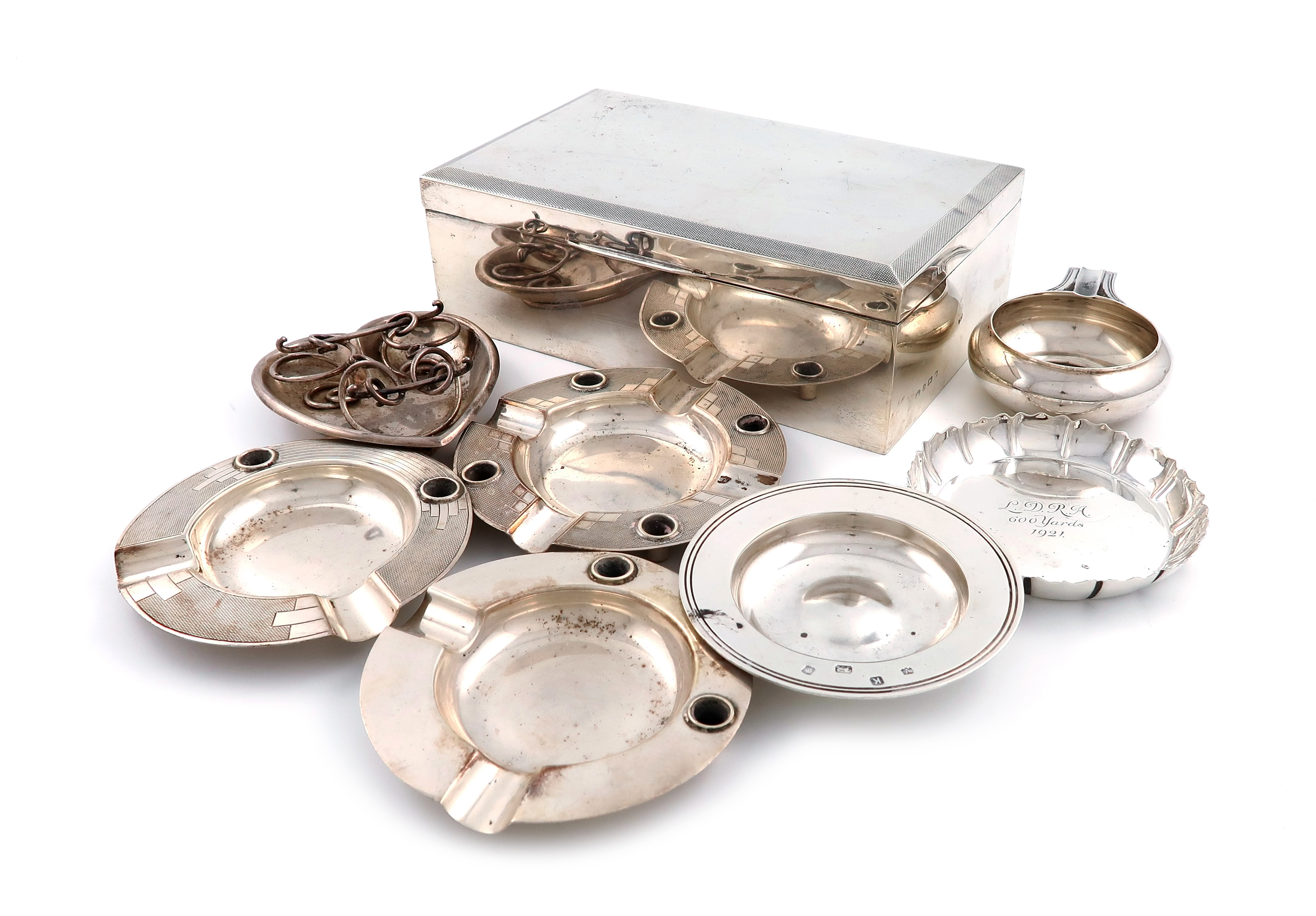 comprising: a cigarette box, by The Alexander Clark Manufacturing Company, Birmingham 1923, rectangular form, the hinged cover with a band of engine-turned decoration, length 22cm, plus a Victorian heart-shaped ashtray, London 1881, an Armada dish, three circular ashtrays with engine-turned decoration, and two other ashtrays, approx. weighable 20oz. (8)