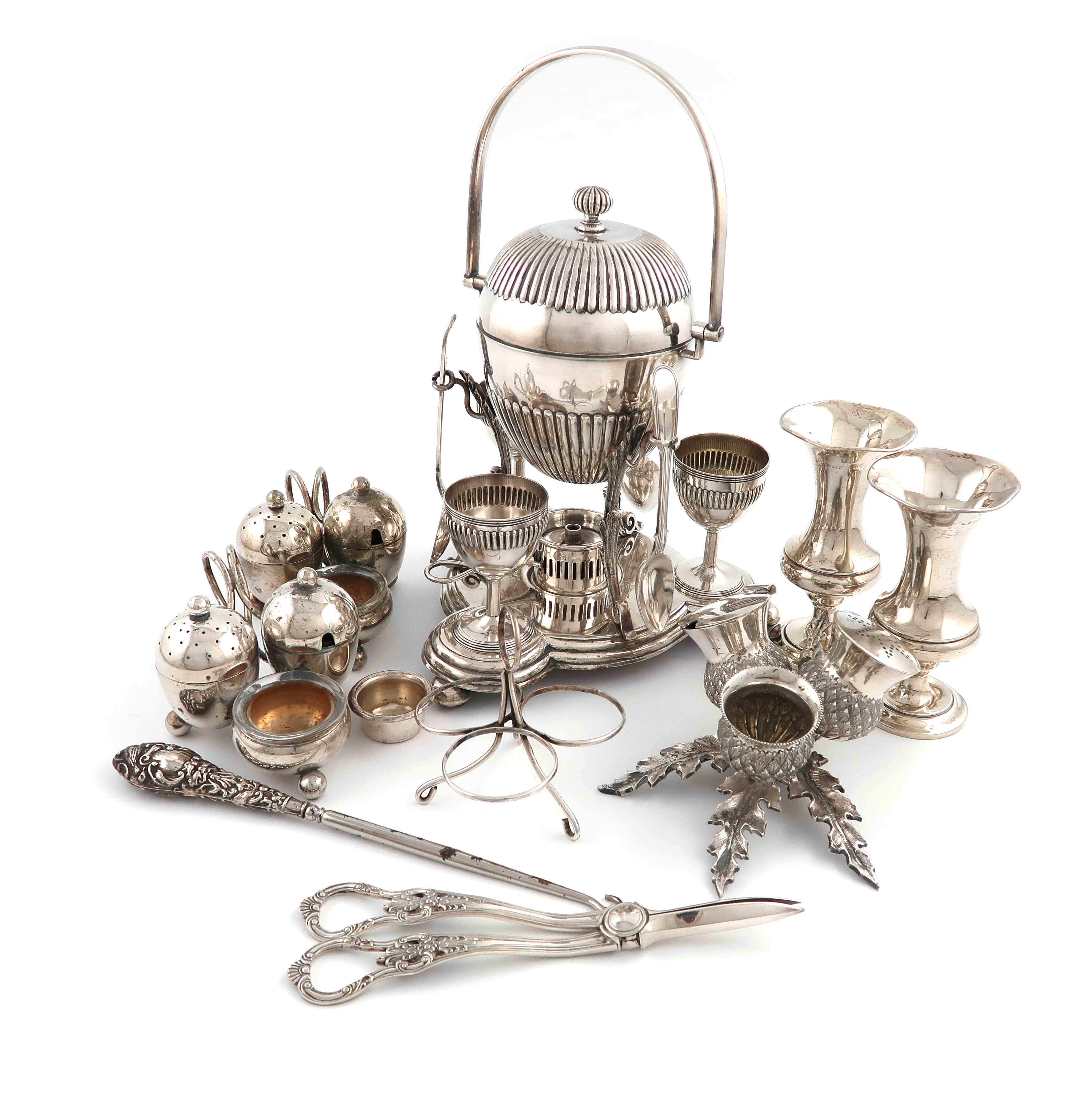 comprising silver items: a pair of vases, by The Gorham Manufacturing Company, London 1910, and a button hook, plus electroplated items: a thistle condiment set, an egg coddler, with a burner and three egg cups, the fluted cover, swing-handle, with three egg spoons, and two condiment sets and a pair of grape scissors. (8)