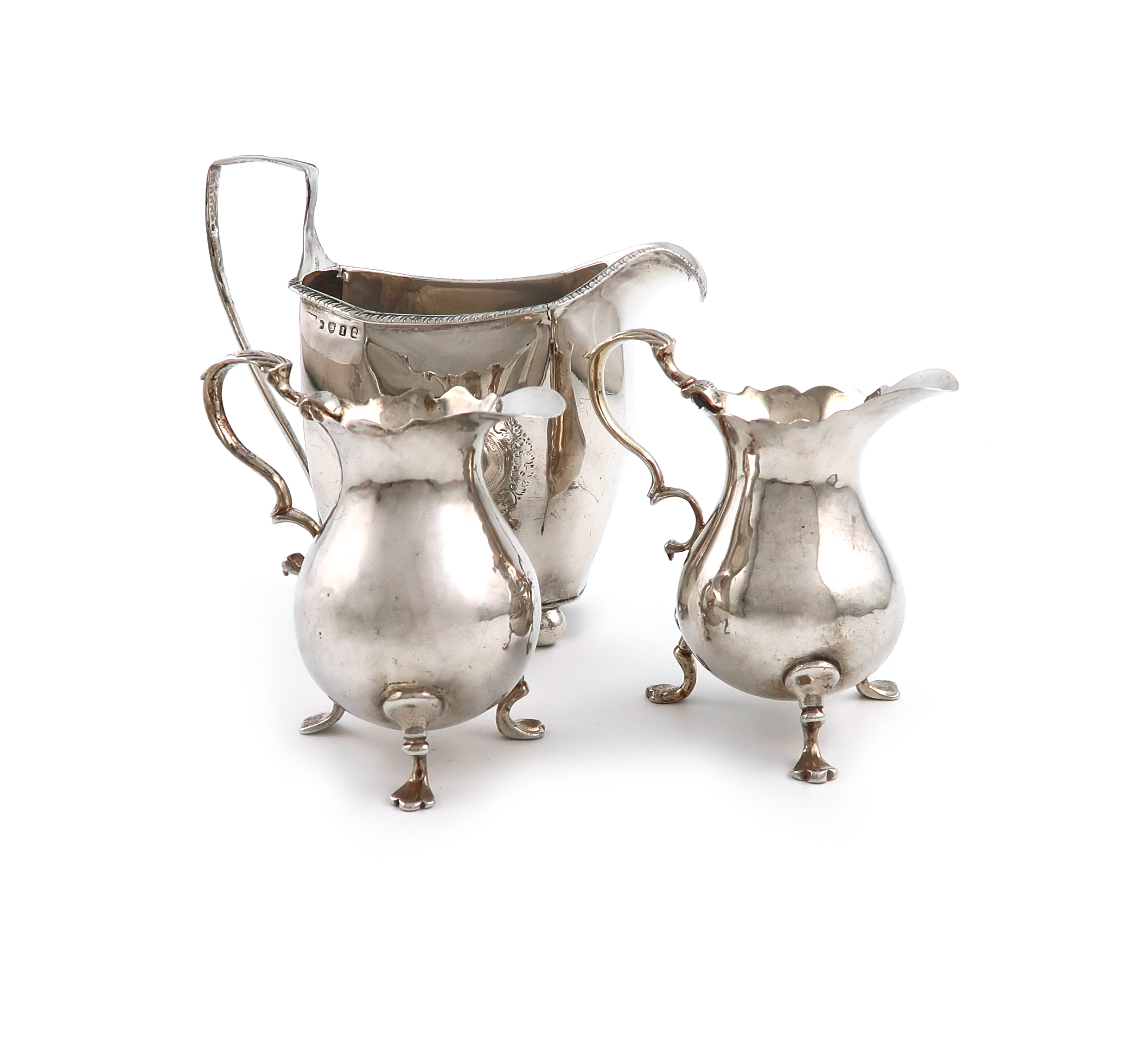 comprising: a George II one, by Richard Kersil, London 1744, baluster form, wavy-edge border, leaf capped scroll handle, on three scroll feet, plus another similar, and a George III cream jug of panelled oblong form, approx. weight 10oz. (3)