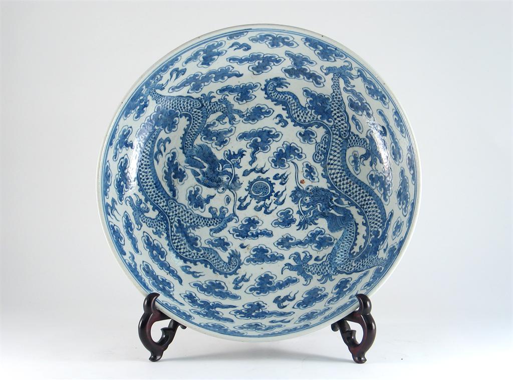 A Chinese blue and white dish, painted with two dragons contesting a flaming pearl, 19th century, 39cm.