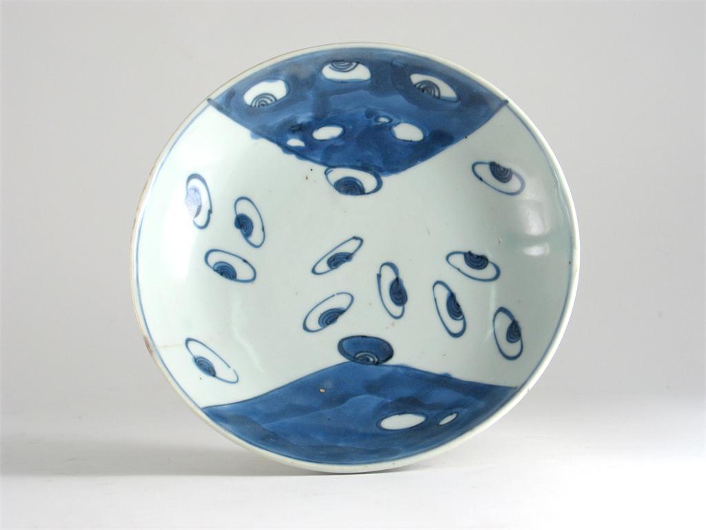 An unusual Chinese blue and white saucer dish, decorated with seashells, on a wide white band. Firing fault. A six character Chenghua mark but Chongzhen c.1628-44, 17cm.