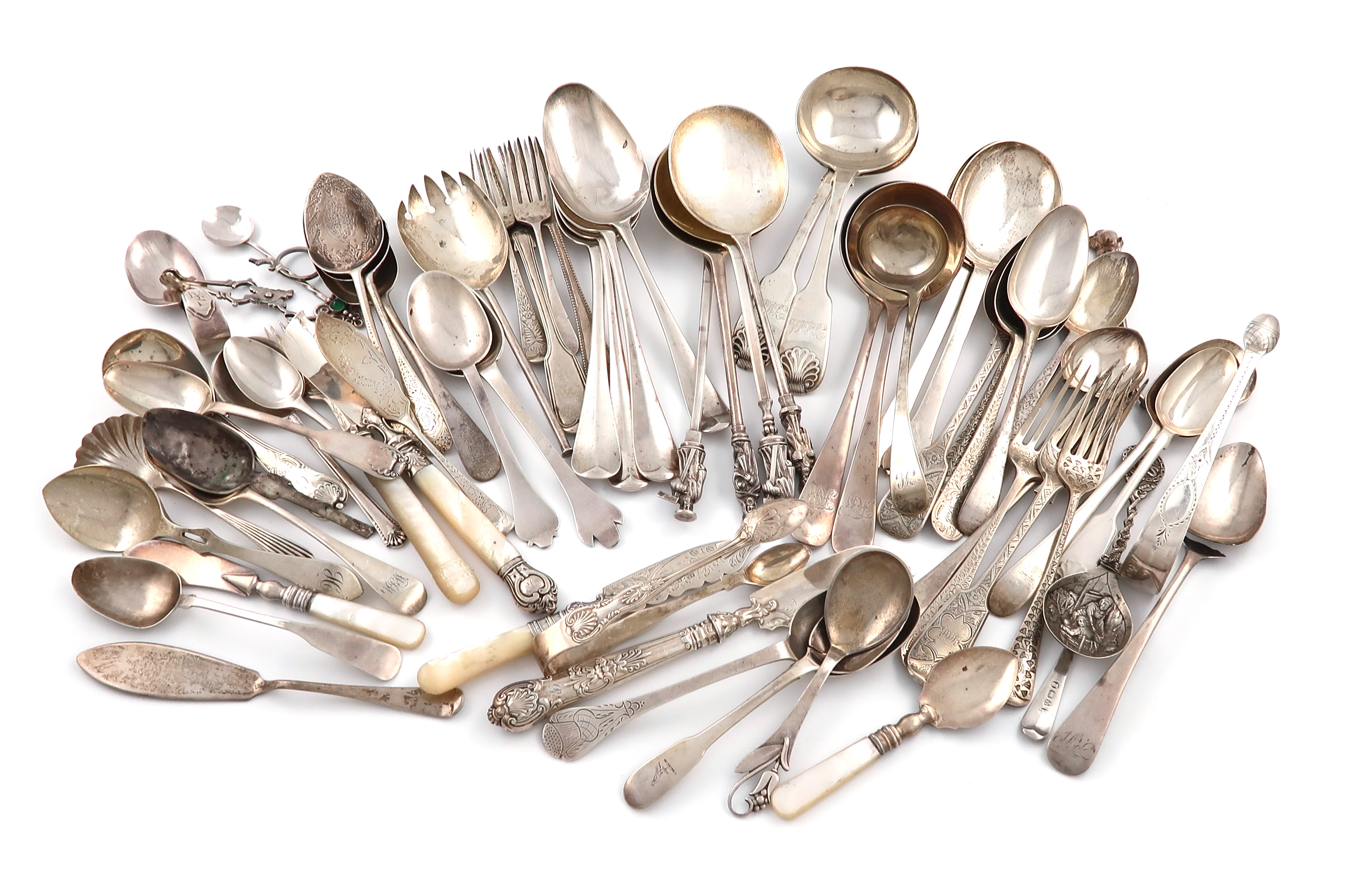 comprising: four Victorian Apostle spoons, a pair of Trefid spoons, two pairs of sauce ladles, four tablespoons, two pairs of sugar tongs, six butter knives, a toddy ladle, a pair of jam spoons, a caddy spoon, a sugar spoon, nine various forks, a George Hart thistle spoon, three dessert spoons, ten various other spoons and other item, approx. weighable 70oz. (qty)