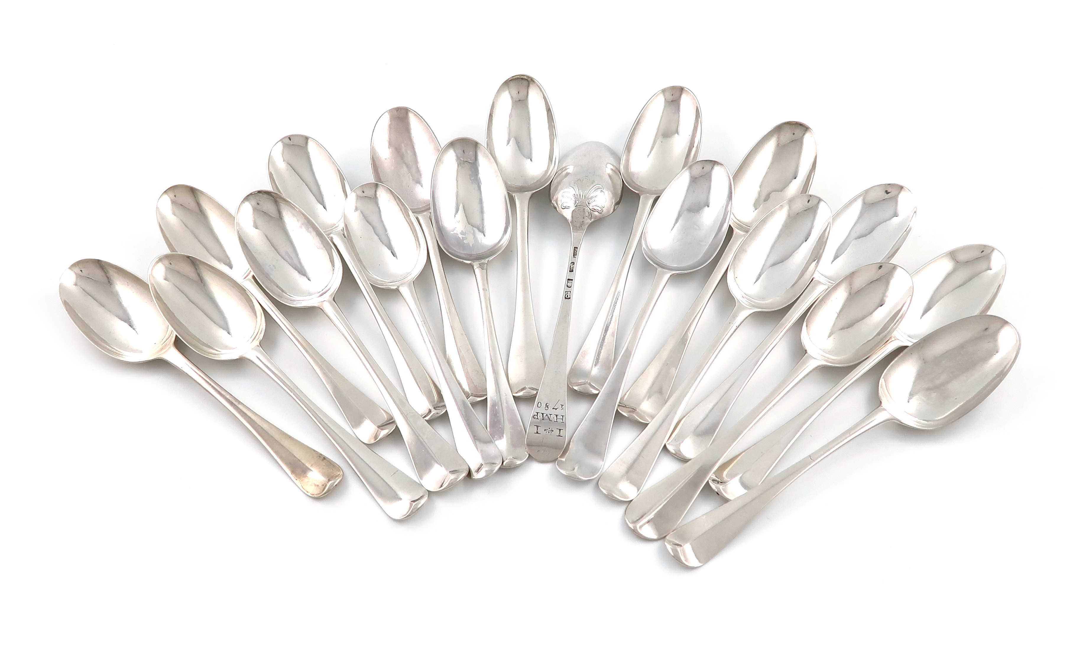 the reverse of the terminals with crests and initials, eleven with plain rat-tails to the reverse of the bowls, one with a shell motif and six with plain heels, approx. weight 33oz. (18)