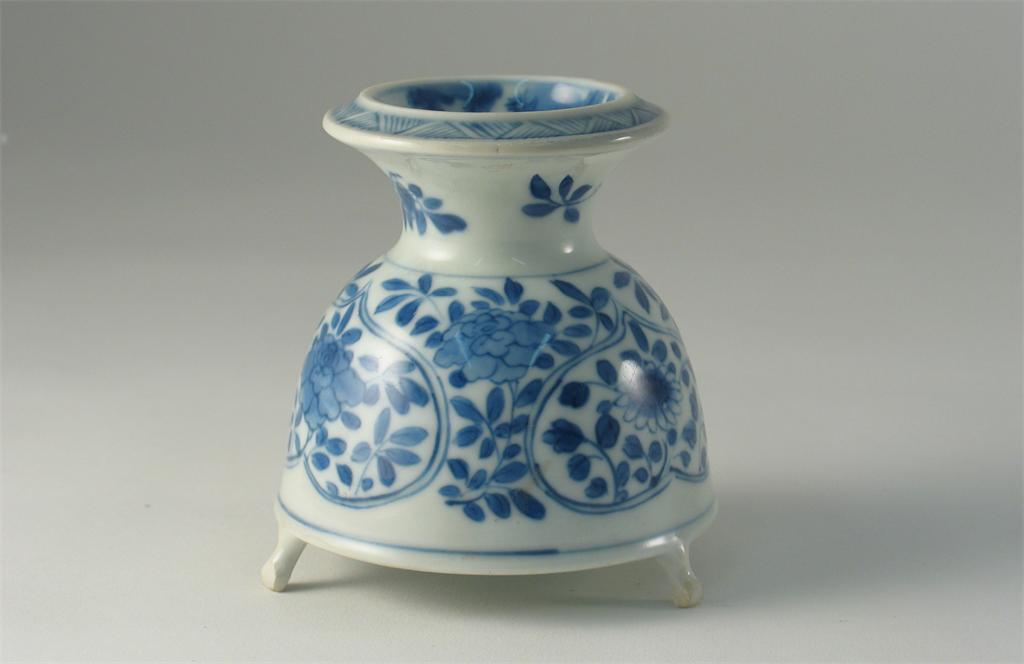 An unusual Chinese blue and white salt, after a European metal form, the top painted with a maiden, the domed body with panels of flowers. A little good restoration. Kangxi 1662-1722, 9cm.