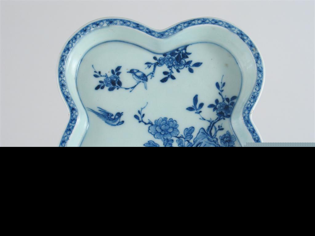 A Chinese blue and white quatrefoil dish, decorated with birds, rockwork and peony, 18th century, 22cm.