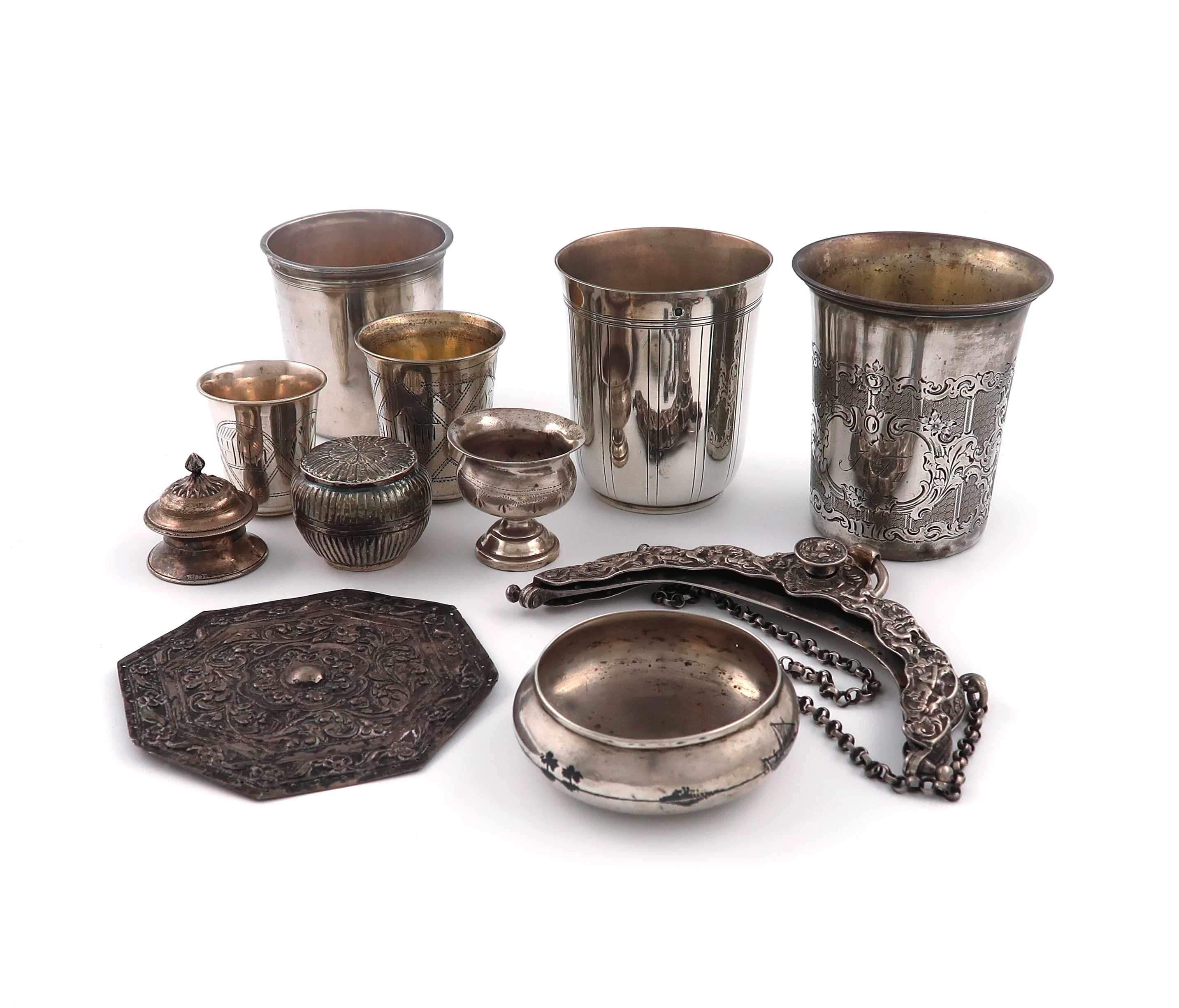comprising: five assorted beakers, tapering circular form, four with engraved decoration, various heights, an embossed handbag mount, a pot in the form of a poppy seed head, a bobbin shaped pot, a small bowl on baluster support, a compressed circular bowl with enamelled desert scene, plus an embossed octagonal plaque, approx. weight 16oz. (11)