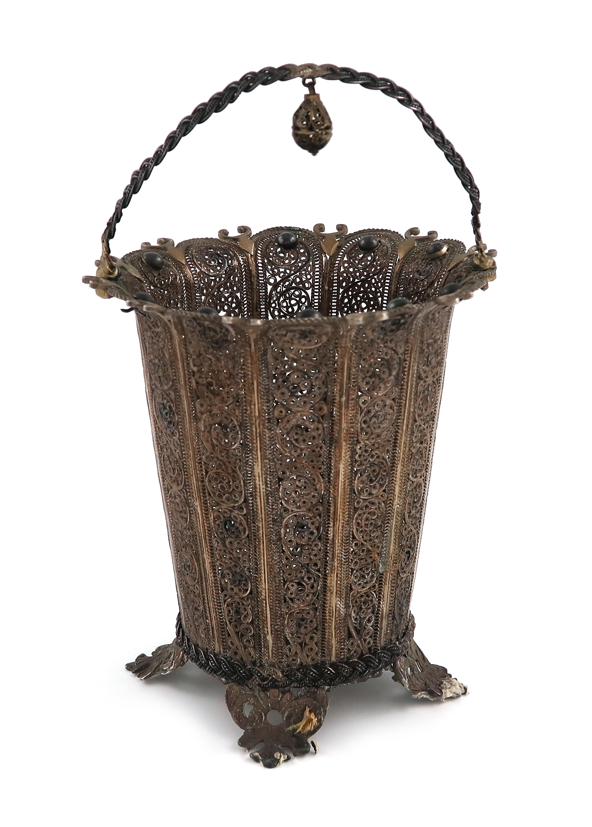 tapering circular form, with niello stud decoration, scroll border with eleven scroll spoon supports, pierced swing-handle, on four pierced bracket feet, height 19cm.