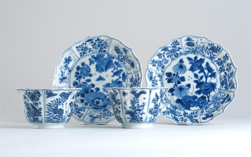 A pair of Chinese blue and white lotus moulded teabowls and saucers, painted with panels of birds amidst flowers, the interiors with flower sprigs, yu marks, Kangxi 1662-1722. (4)