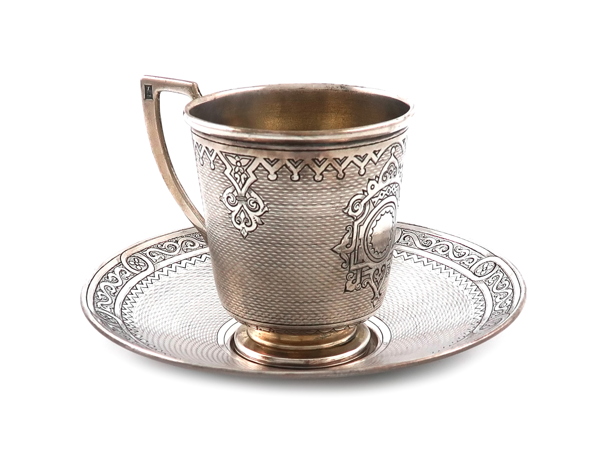 tapering circular form, engine-turned decoration, chased borders, the interior gilded, diameter of saucer 13.3cm, approx. weight 8.8oz. (2)