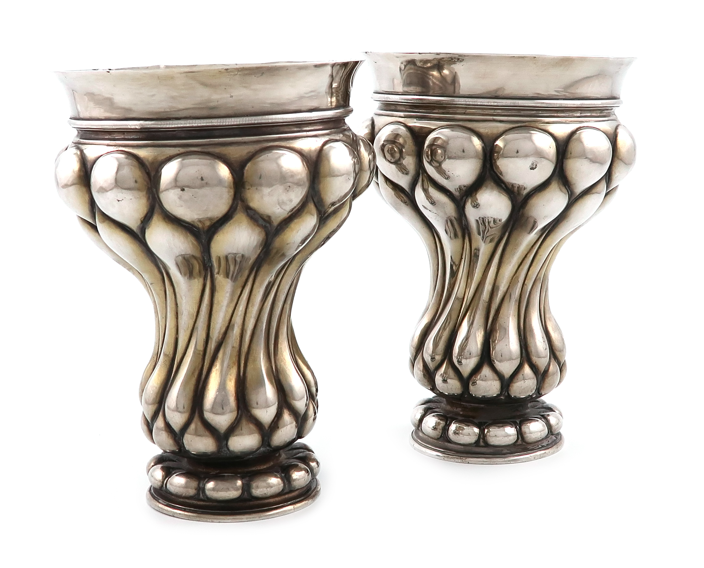 tapering lobed form, plain rim, on raised lobed bases, height 18cm, approx. weight 29oz. (2)
