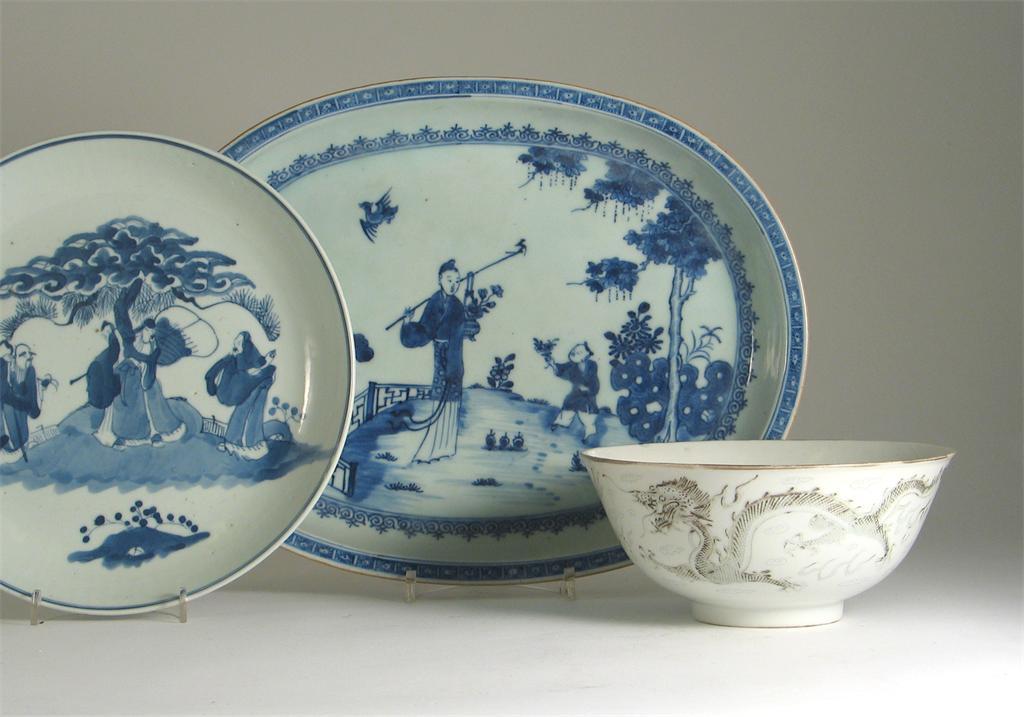 A Chinese blue and white oval dish, decorated with two figures in a garden, a Chinese saucer dish painted with four figures beneath a tree and a bowl decorated with two dragons chasing pearls, six character Guangxu mark, 18th century and later, 33cm. (3)