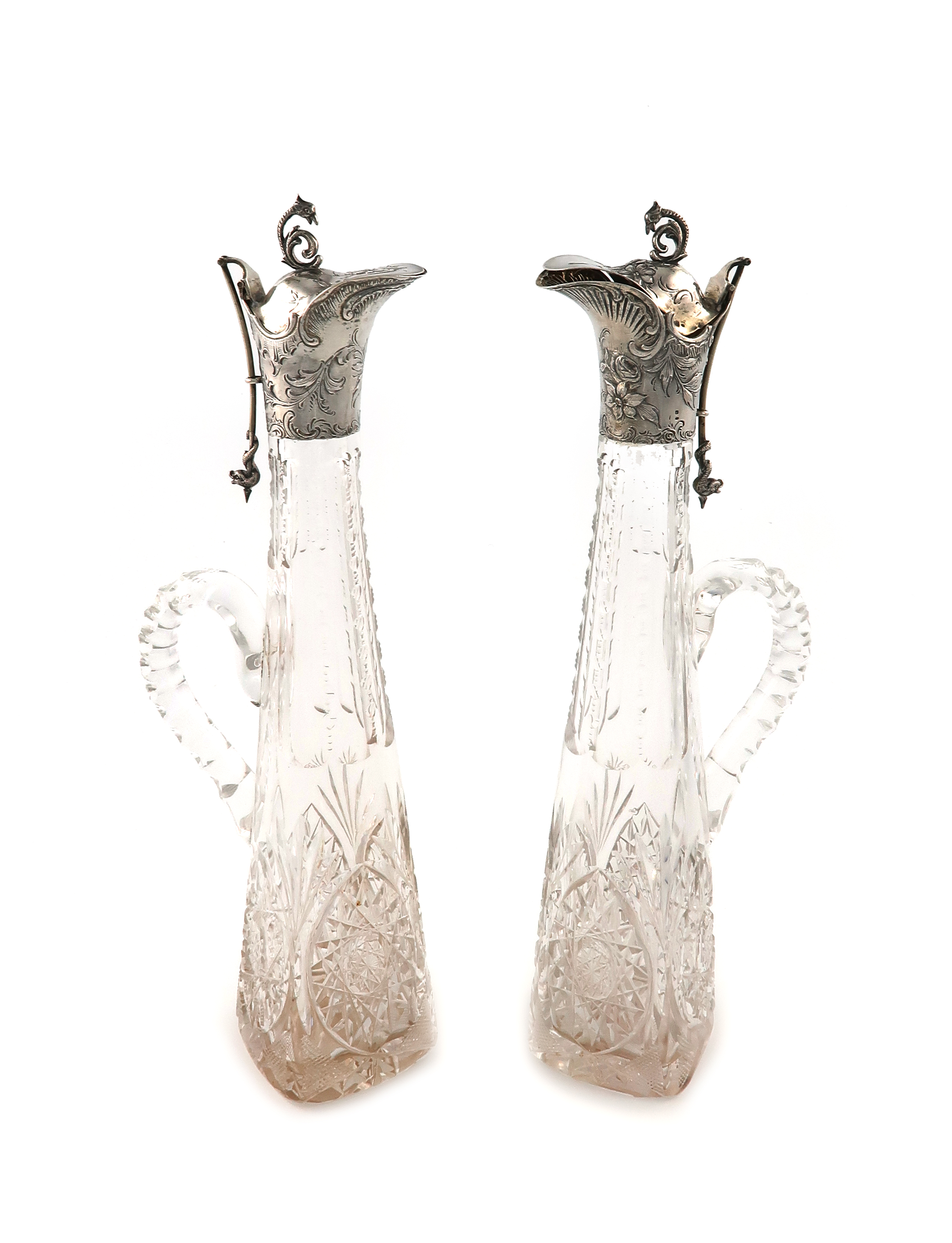 tapering rounded square form, cut glass decoration, scroll handles, the mounts with foliate scroll decoration, the hinged covers with a scroll finial and with an opening mechanism with a mythical dolphin, height 33cm. (2)